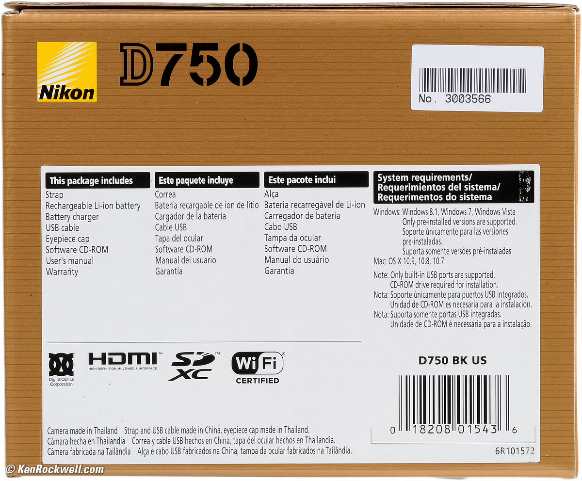 Getting a Legal USA Version top Sample Images Intro Lenses Specs USA Version Accessories Performance Compared Usage Recommendations M I'd get my D750 used at eBay (How to Win at eBay). This only applies in the USA, of course. If you make the mistake of buying at retail or from other than a recommended dealer, you may have been sold an illegal gray-market version. Send it back while you still can, and if the dealer tries to tell you otherwise or offer a bogus extended warranty, dispute the charge with your credit card company and you won't have to pay. Gray-market cameras have no warranty in the USA, will get no firmware upgrades, and will not be serviced by Nikon. I usually buy gray-market manual-focus lenses since they'll never need service, but digital SLRs always need service, support and firmware updates. Nikon is no longer supplying parts to independent service shops, so if you get stuck with a gray-market D750, when it needs service or an update, you're out of luck. A store might try to offer a worthless third-party warranty, but if you ever need to use it you'll discover it's worthless. Never buy a gray-market digital camera. Legal USA versions have "US" after "D750 BK" above the UPC symbol: Nikon D750 box end. bigger. Inside the box, you'll find yellow Nikon USA warranty paperwork, and also a white "U-S" sticker on the plastic bag holding the manuals: Nikon D750 box contents. bigger. If you buy from a first-class dealer, you'll never need to worry about this. The problem is that if you don't check and if you buy from retail or someplace other than a recommended online source and get stuck with a gray-market version, you won't know until it's too late. Never buy at retail; Nikon doesn't seal its boxes so you can't tell if you're getting a used or switched-out product.