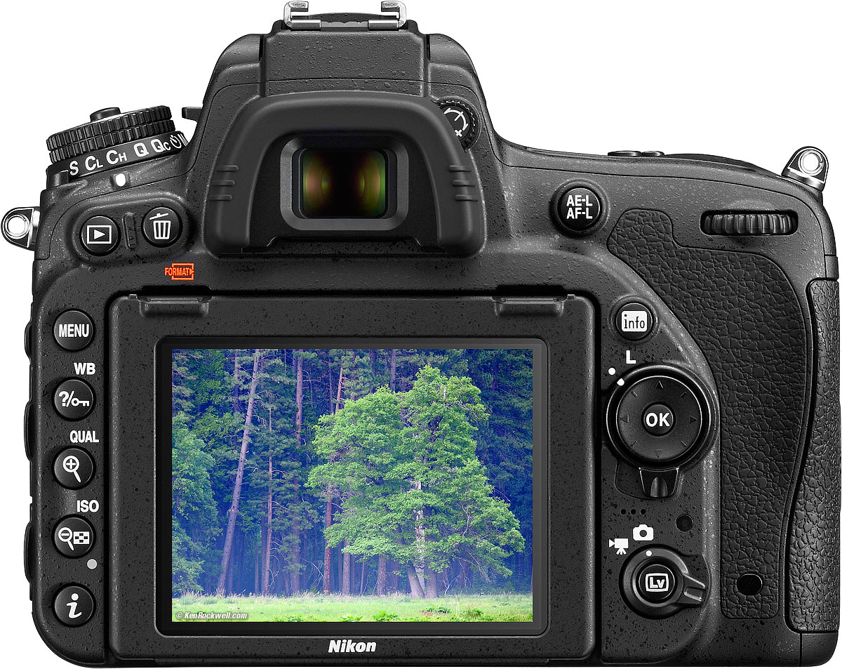 Rear LCD It seems like the same thing as the D810 and $6,000 D4S — except it also tilts! 3.2" (8cm), 1,228,800 dots (640x480 x YRGB). Each pixel now adds a white dot, in addition to the traditional RGB dots, to allow greater brightness. 170º viewing angle when fixed. Flips up 135º and down 90.º Does not move left or right, and cannot flip 180º for self portraits.