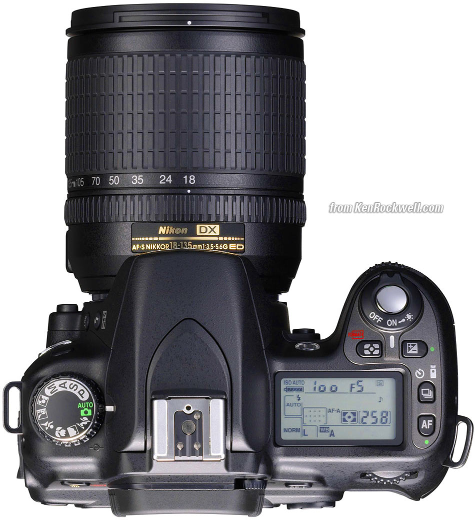 This says that in addition to the D80, you also get: a Strap, Body cap, Eyepiece cap (if for some reason you have no eyes or fingers with which to keep the sun from shining in the eyepiece and confusing the light meter), Rubber eyecup (they often fall off and I don't miss them), USB cable, Quick Charger (MH-18a) with AC power cord, Audio/Video cable (to hook to a TV for playback), EN-EL3e rechargeable Li-ion battery, protective battery cover for battery storage (and of course the camera's own battery door and rubber connector covers are included), Clear protective LCD monitor cover (called "BM-7" by the resourceful Japanese), Hot shoe cover (I have no idea why you'd need this - you have to pull it off to attach a flash - maybe that's why Nikon aptly names it "BS-1"), Software CD, Manuals and Warranty and Registration cards. If some store tries to scam you out of these things or charge extra for them, run! Don't even bother pointing out the side of my box above. Honest stores don't haggle with you for the accessories They are included, just like a new car comes with tires and a steering wheel at no extra charge. In my box there is one box with the body, and another smaller box with all the other booty. There are things in there I never open, like the software (I avoid camera maker software), manuals (I download them) and warranty cards (I register online). I haven't used the new battery: since it takes all the same batteries I've been using with my D200 I haven't bothered to open the new one or the charger, or anything except the body itself. Thank Goodness most of these items are interchangeable among the D50 / D70 / D80 / D100 / D200. Not Included: You'll have to buy your own memory card (I use a 2GB SanDisk SD card) and lenses. Forget card readers: you can download directly from the D80 simply by plugging it into a USB port. It appears as a new drive and downloads FAST by dragging the files to your hard drive. When you get the kits you actually get another box with the lens. Optional Accessories: MB-D80 Vertical Grip with command dial, vertical release and AE/AF-lock button. It takes one or two EN-EL3e batteries or six AA batteries. For AAs it runs on alkaline, Ni-MH rechargables, expensive throw-away lithium and those crappy "Heavy Duty" nickel-manganese batteries sold in discount stores and tiendas across the third world. ML-L3 Wireless IR Remote Control (same as D70). MC-DC1 Wired Remote Cord. Size: 5.2" x 4.1" x 3.0." (132 x 103 x 77 mm). This is a little smaller than a D70. It's the same depth and width as the D50 but a little taller. Weight: 21 oz (585 g.) naked: without battery, memory card, body cap, or monitor cover. This is the same as a D70. Price: $999. Introduced: August 9th, 2006. Availability: Shipping in the USA since September 1st, 2006. Nikon D80 with new 18 - 135 mm lens. enlarge USERS MANUAL The USA manual can be seen here, and here if you're silly enough to want to print it. THANKS Thanks to Rob from Maryland for reminding me to order my D80 the day it came out! This page is also in Romanian. PLUG If you find this as helpful as a book you might have had to buy or a workshop you may have had to take, feel free to help me continue helping everyone. It also helps me keep adding to this site when you get your goodies through these links to Ritz, Amazon and Adorama. I use them and recommend them personally . Thanks for reading! Ken