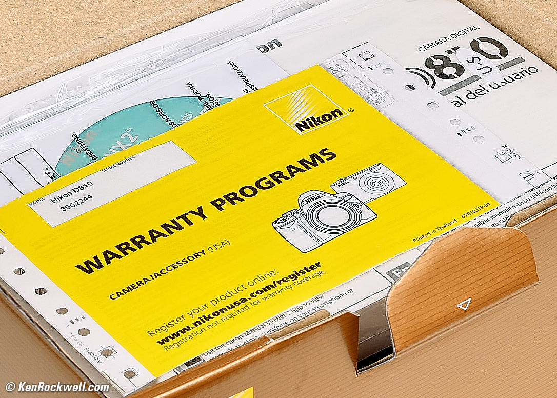 Legal USA Versions (USA only) top Sample Images Intro Compatibility Specs USA Version Accessories Performance Compared Usage Recommendations More Today I'd get another D810 used at eBay (How to Win at eBay), if not used at Adorama (see "Shop Used") or used at Amazon, or consider the newest D850. If you bought from other than a recommended dealer, you may have been sold an illegal gray-market version. Send it back while you still can, and if the dealer tries to tell you otherwise or offer a bogus extended warranty, dispute the charge with your credit card company and you won't have to pay. Gray-market cameras have no warranty in the USA, will get no firmware upgrades, and will not be serviced by Nikon. I usually buy gray-market manual-focus lenses since they'll never need service, but digital SLRs always need service, support and firmware updates eventually. Nikon is no longer supplying parts to independent service shops, so if you get stuck with a gray-market D810, when it needs service or an update, you're out of luck. A store might try to offer a worthless third-party warranty, but if you ever need to use it you'll discover it's worthless. Never buy a gray-market digital camera. Legal USA versions have a (U) after "D810" above the UPC symbol: Nikon D810 Box, USA version. enlarge. Inside the box, you'll find either yellow Nikon USA paperwork as shown, or more recently a gray Nikon USA warranty card, and also a "U-S" sticker on the plastic bag holding the manuals: Nikon D810 USA Version. bigger. If you buy from a first-class dealer, you'll never need to worry about this. The problem is that if you don't check and if you buy from other than a recommended source and get stuck with a gray-market version, you won't know until it's too late.