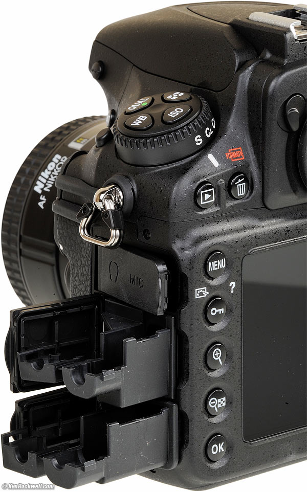 Strain reliefs (included). These little pieces of plastic are strain reliefs. They come with the D810 and poke into the USB and HDMI sections and help prevent a yanked cable from breaking your D810. You clip them around your cable and then plug them into the D810: D810 cable strain reliefs (no cables shown). bigger.
