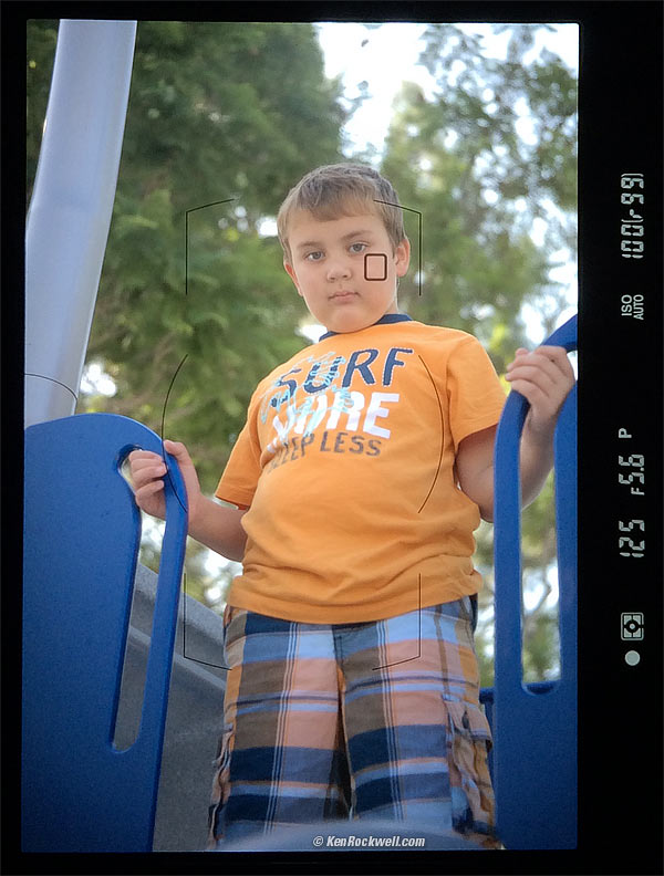 Autofocus performance top Autofocus is fast and sure, and works in any light. Much better than the D600 and D610, AF sees into the dark and doesn't go blind and hang up in the dark as does the D610. Just like all full-frame DSLRs, the AF system has many sensors, but they're all in the center. There are no AF sensors near the sides, corners, top or bottom. Even if it's so dark that we're shooting at ISO 12,800 at f/2.8, the D810 sees and focuses and shoots as if it's in daylight. Its Auto-Area select is instantaneous, and magically recognizes faces and focuses on and tracks the nearest eye as people move around. If locks-on and tracks anything, all automatically. Bravo! Ryan swinging, 02 August 2014. Nikon D810, Nikon SB-400 flash, 55mm f/2.8 AF Micro-NIKKOR, f/8 at 1/125 at ISO 100, Perfectly Clear. bigger. It has no problem tracking a kid on a swing at close distance. The image in the finder doesn't always seem like it's in focus, but the on-film image is usually right-on, even with the 30-year-old screw-focus lens I used above. The AF assist light almost never comes on because it doesn't need to. No one likes to have that light shine in their face, and with the D810, it doesn't. As covered at the top, the D810 easily finds focus, and then tracks the subject all over the frame if you set it to do that (Auto AF-Area Select mode: hold AF button under lens > turn front command dial > Auto). Magnificent is that Auto AF-Area select uses facial recognition. It finds the face and focuses on in, even if it's not in the center and even if it's not the closest thing to you: Auto AF-Area Select: Finds the face even if it's not in the center and even if it's not the closest thing. (Actual view through viewfinder; pretty sharp, eh?) I didn't select this AF area, the camera did, and it tracks all around the finder as the subject moves. bigger. When the face is close enough, it is smart enough to focus on the closest eye all by itself, which is perfect! It even thinks this smart and this fast if I'm behind my subject. Here the D810 sees and focusses on the nearest eyelash: Ryan at Rite-Aid, 06 August 2014. (Nikon D810, Nikon 28-300mm VR at 28mm, f/3.5 at 1/125 at Auto ISO 1,400, Perfectly Clear.) bigger. Here's a crop of the eyelashes: Crop from above at 100%. If this is 6" (15 cm) on your monitor, the complete image would print at 24 x 36" (60 x 90 cm) at this same high magnification.