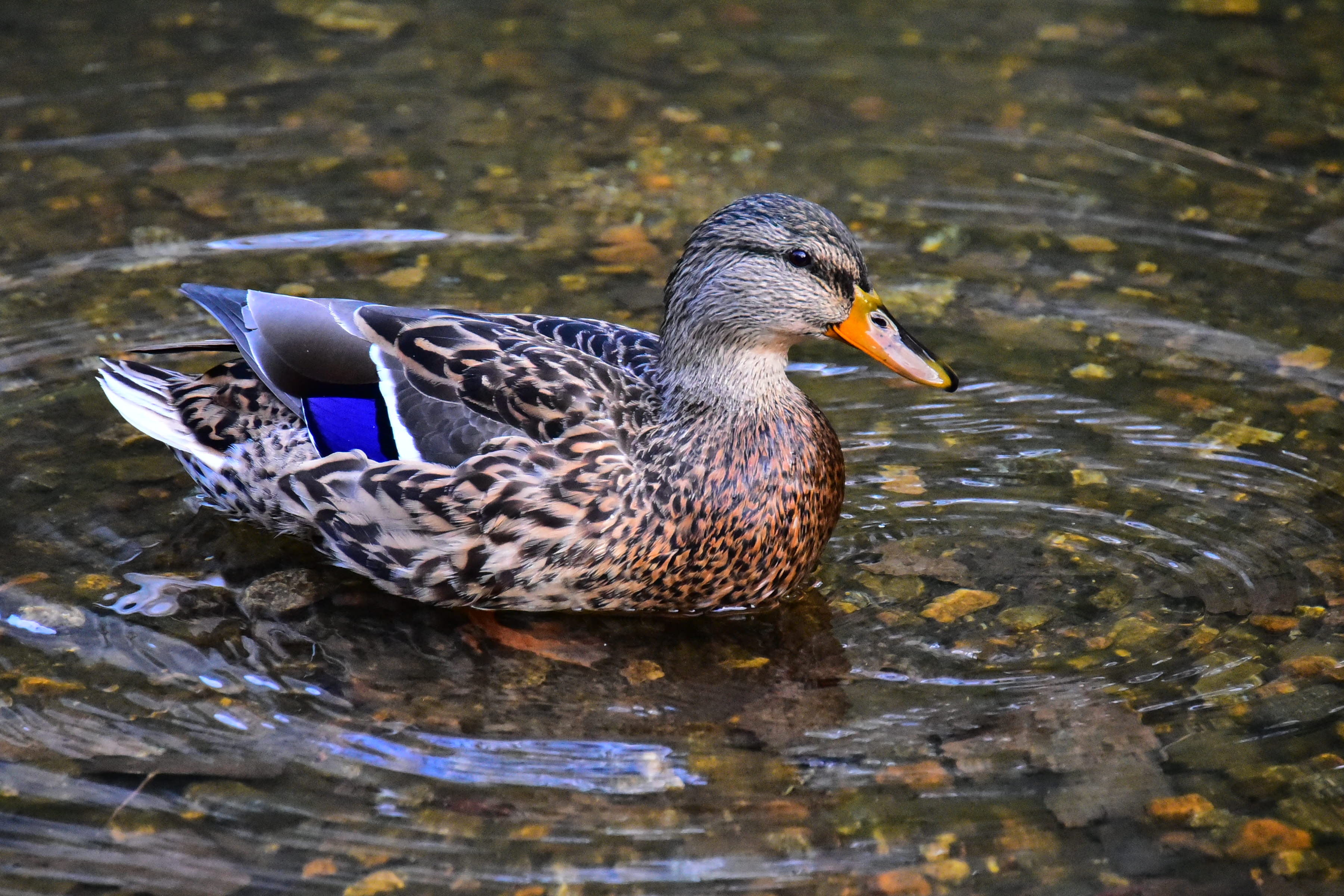 Duck, Merced River, Yosemite, 5:22 PM, 17 October 2014. (Nikon D810, 28-300mm VR at 300mm, f/5.6 at 1/500 at Auto ISO 6,400.) Camera-original JPG file. At ISO 6,400, it's still super sharp, and not very noisy at all. At ISO 6,400, it's entirely usable for anything. If you want to see film grain or noise, you're going to have to shoot at much higher ISOs or add it in software.