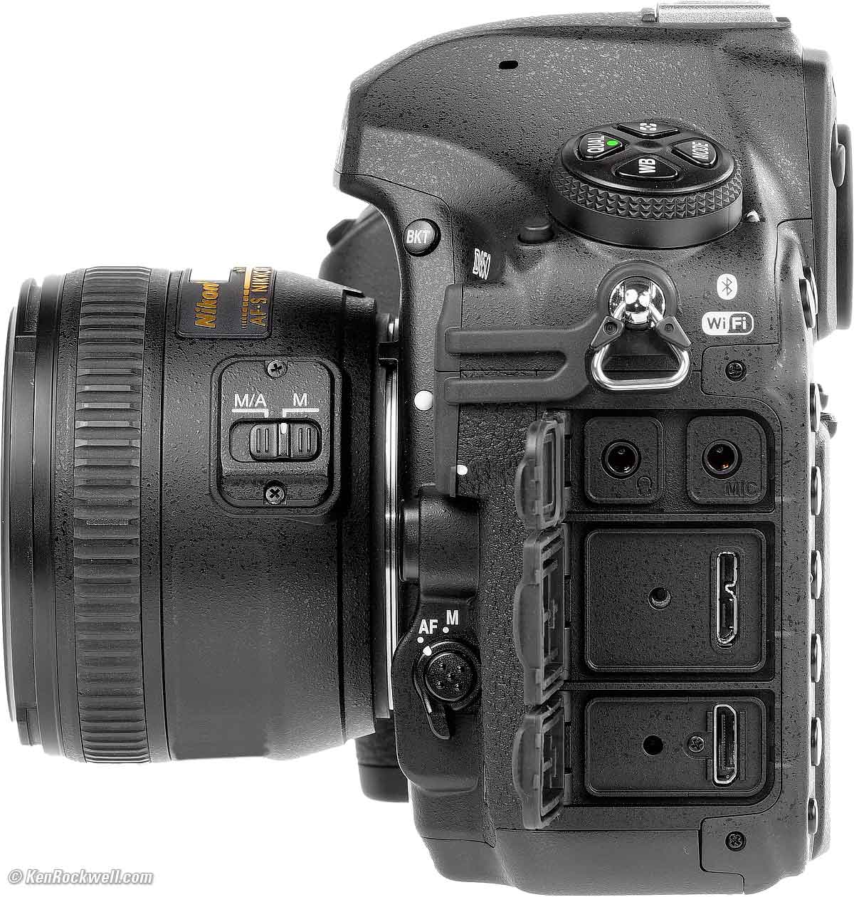 Left side, ports open, Nikon D850 and 50mm f/1.4G. bigger. 3.5mm mic-in. 3.5mm headphone. Mini-HDMI type C. Micro-B USB 3.0. Ten-pin remote terminal for MC-30A or MC-36A remote cords, ML-3 modulite remote control sets, WR-R10 (requires WR-A10 adapter) or WR-1 wireless remote controllers, or GP-1/ GP-1A GPS.