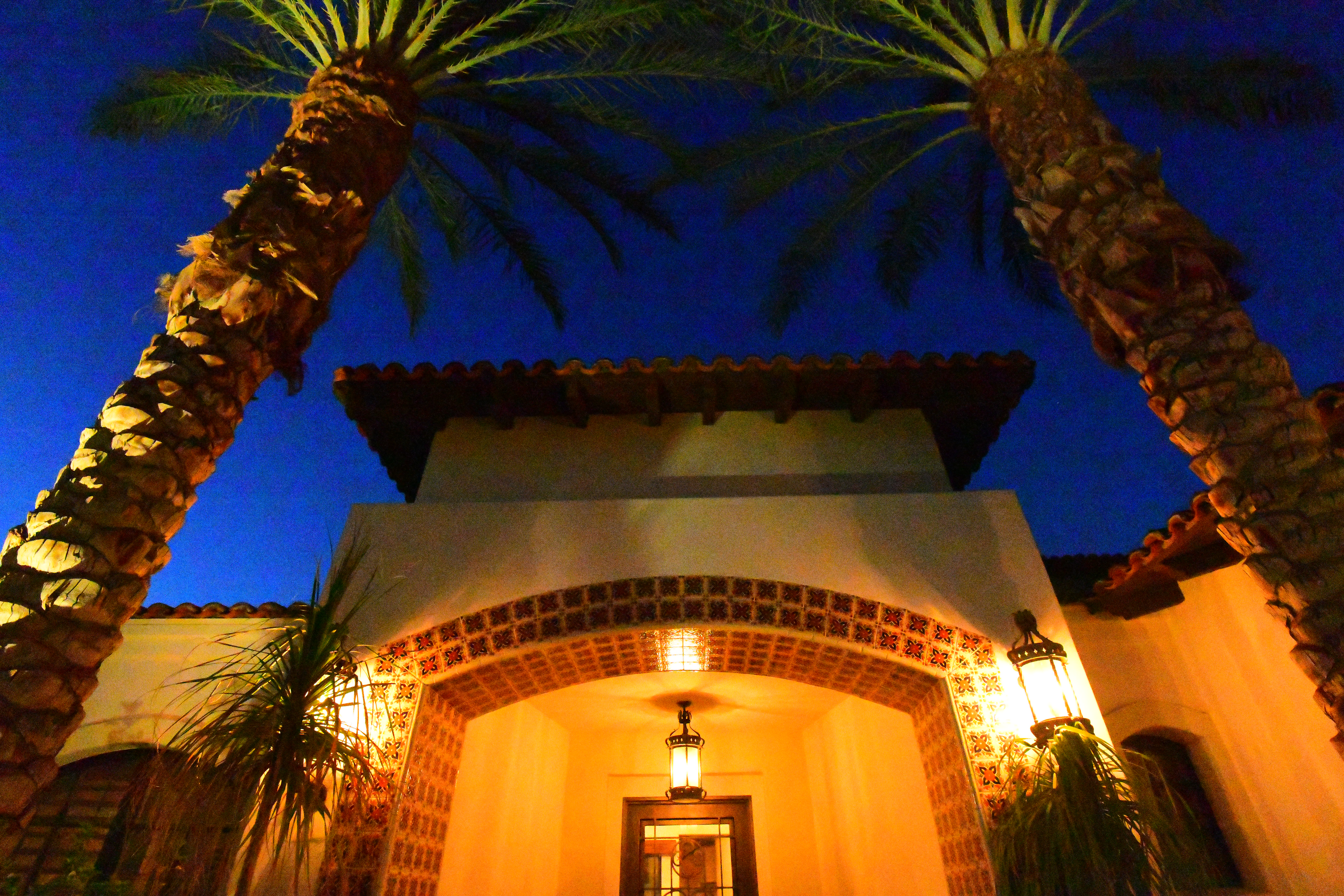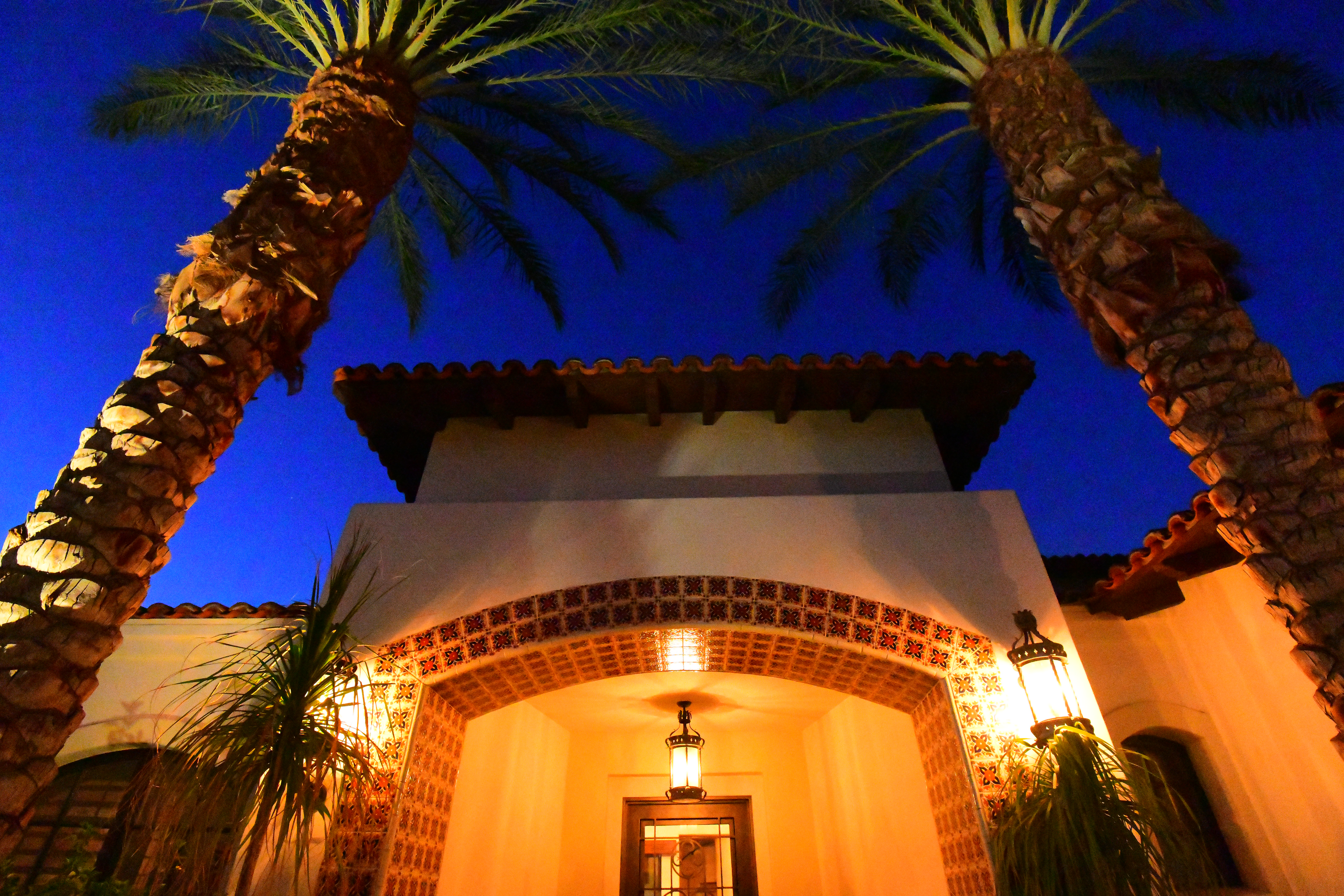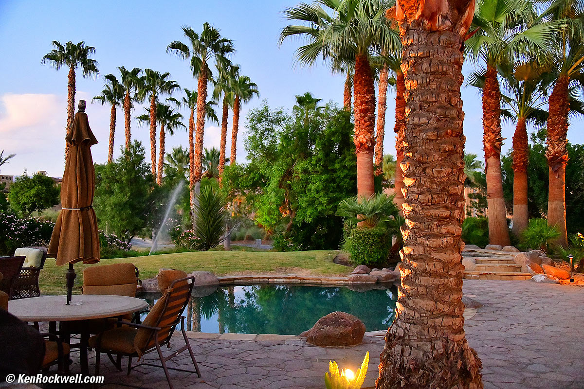 Day turns to Night in the Desert, 26 September 2017, 6:59 PM. Nikon D850, Nikon 28-300mm VR at 35mm, 1/20 hand-held at f/3.8 at ISO 10,000. bigger (only the palm in the foreground is in focus). The D850 captures extraordinary tone and color under any lighting condition. Bravo!
