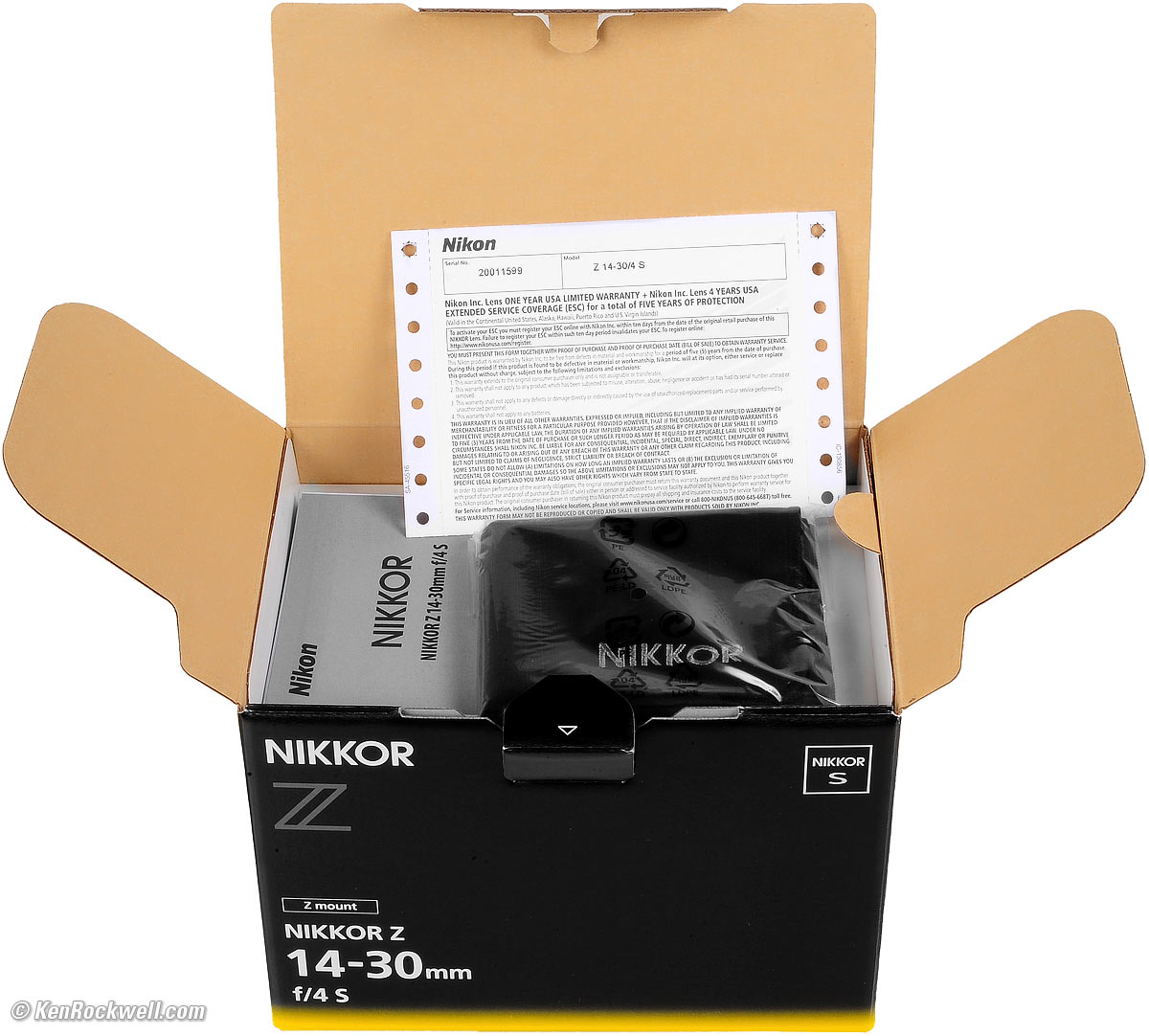 Nikon Z 14-30mm box. bigger. The box and lens are completely unsealed. There is no way to know if anyone else has been fiddling with your lens, swapping parts and accessories, or even if it's a used, dropped, returned or damaged lens. See more at USA Version. I got my 14-30mm at Adorama. I'd also get it at Amazon, at B&H, at Crutchfield, or used at eBay (How to Win at eBay). That's why it's critical only to buy from an approved online source, since they ship from automated warehouses where no shifty salesmen or customers ever get to touch your new camera before it ships. While new $5 CDs, DVDs, Blu-Rays and bottles of milk and drinking water are sealed and quite obvious if anyone's opened them, paradoxically Nikon doesn't bother sealing anything, so your only insurance is to buy only from a trusted online source. Open the unsealed microcorrugated cardboard box, and you'll see a clear plastic bag with the black sack covering the USA warranty card and big folded sheet of instructions in a zillion languages. Open box. bigger. Lift up the inner cardboard flap and you'll see everything packed in corrugami (folded corrugated cardboard). The capped lens is nestled on the left in a thin closed-cell foam bag inside a larger bubble-wrap bag. The hood is in a plastic bag on the right side hidden behind another folded cardboard flap.