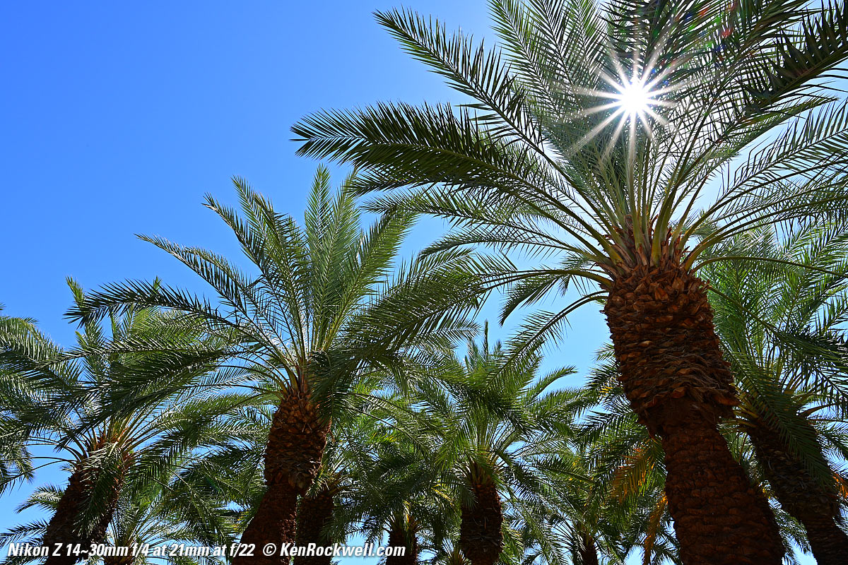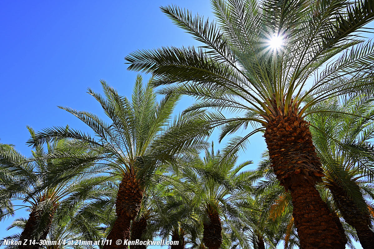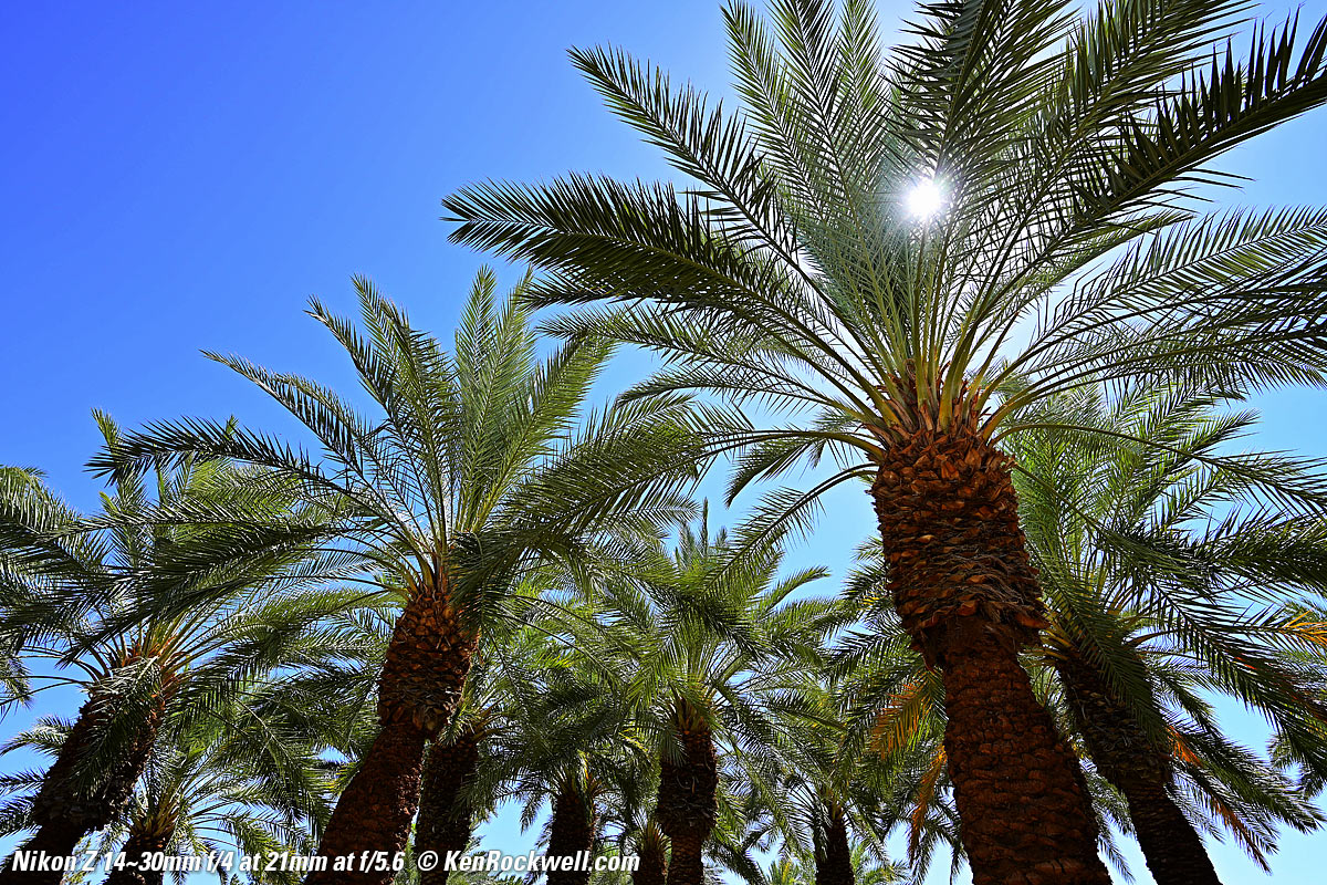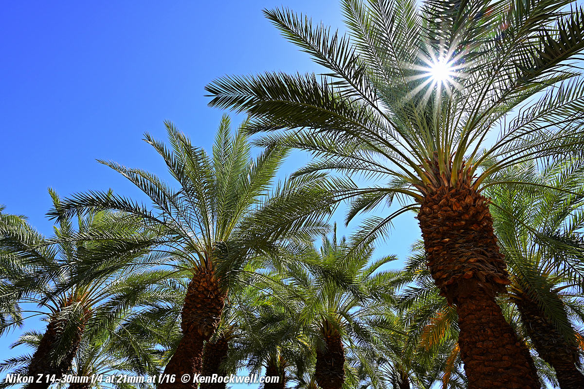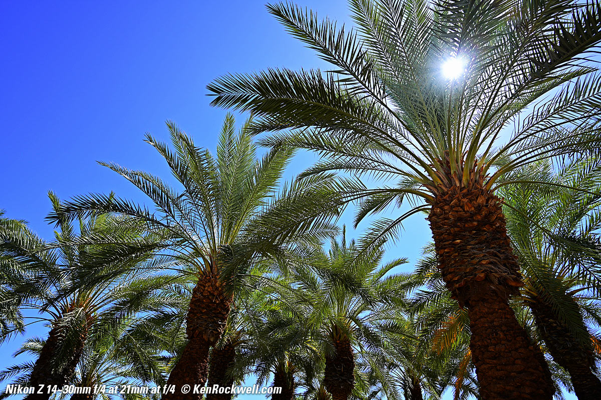 Desert Palm Forest, 22 June 2019, 10:16 AM. Nikon Z7, Nikon 14-30mm at 14mm at f/5.6 at 1/200 at Auto ISO 64, Perfectly Clear v3.7 "landscapes" mode. bigger, full-resolution or camera-original © file. This is exceptional sharpness. Yes the lower right corner is a little softer, but that's because it's closer and not in focus.