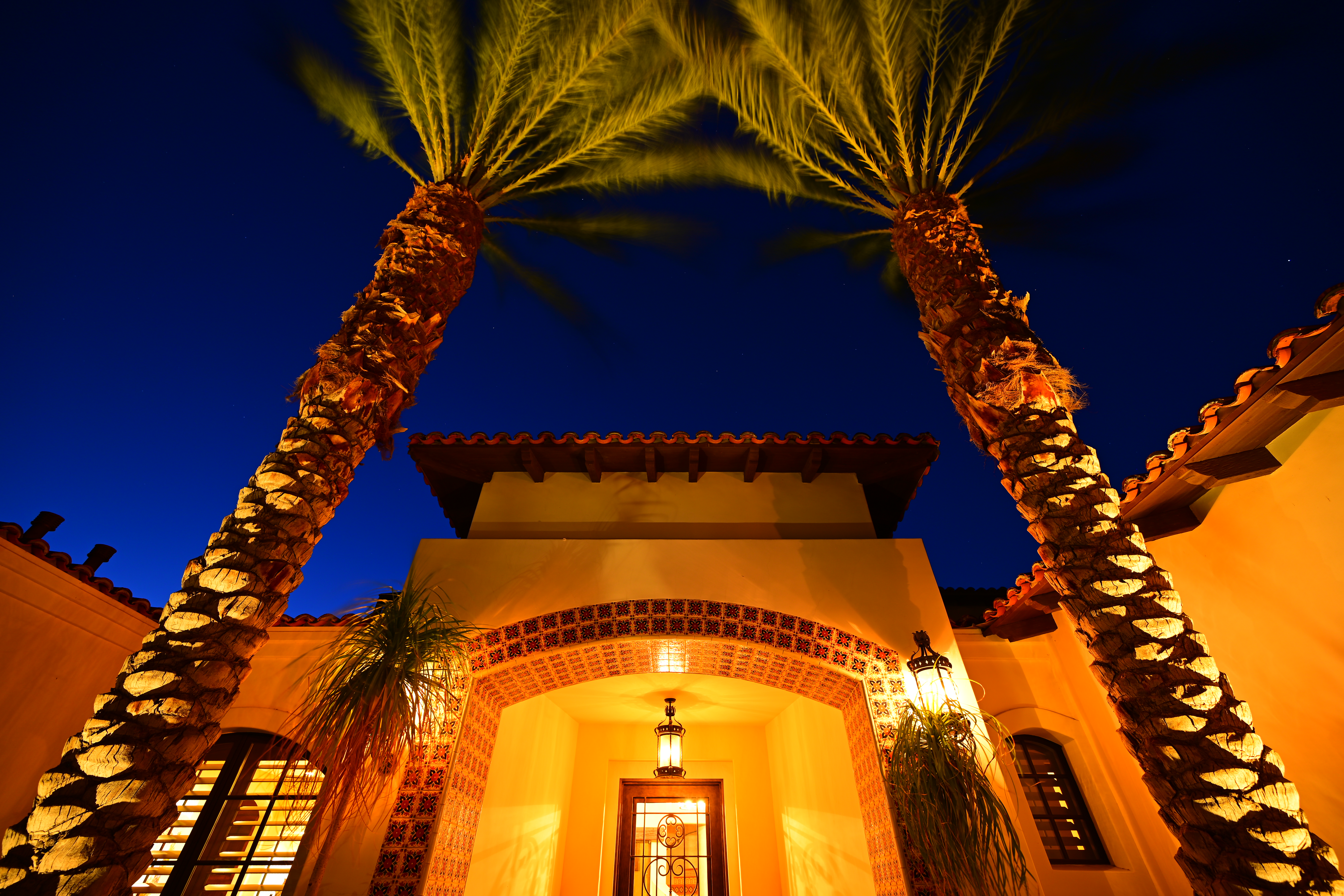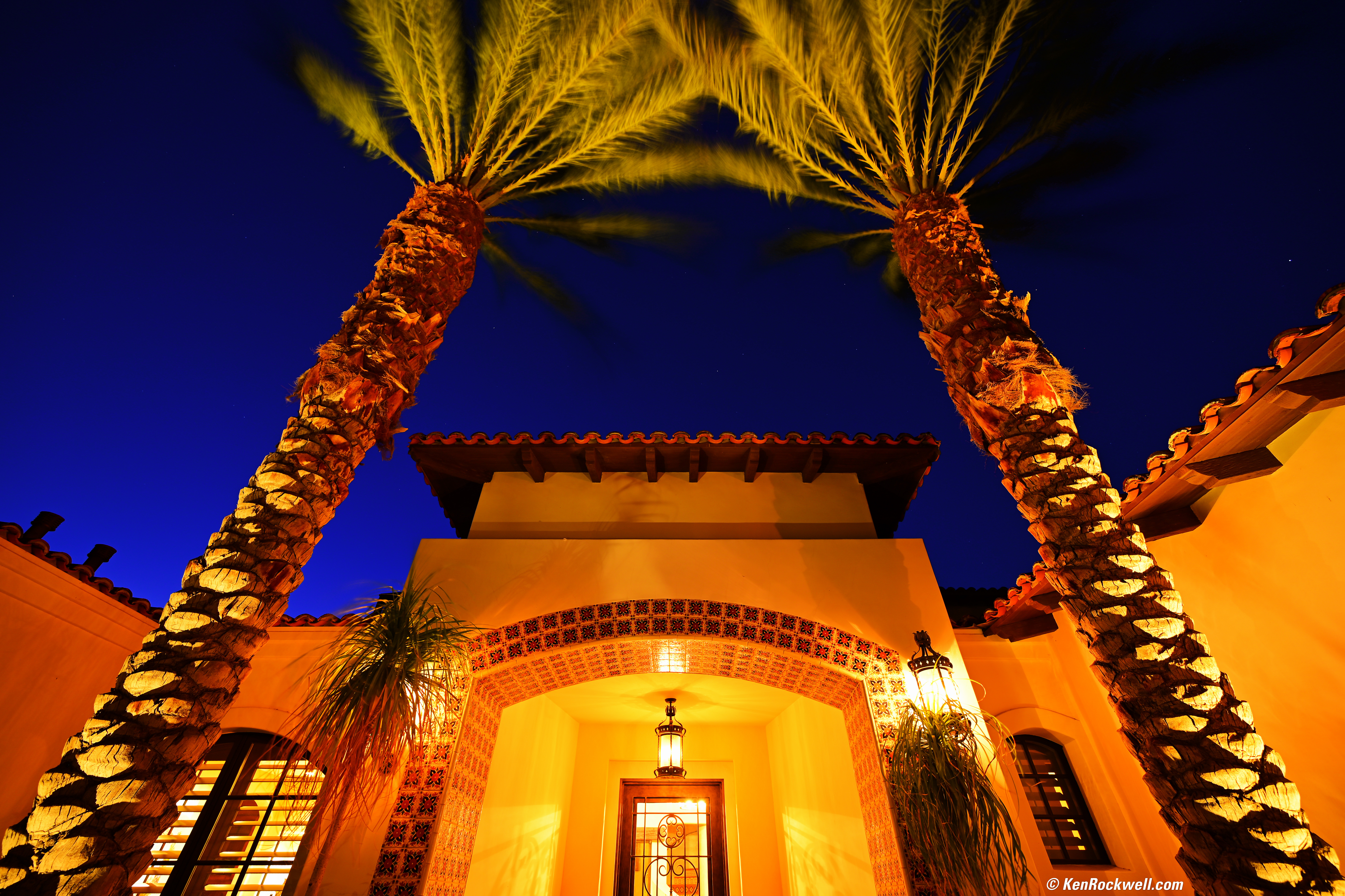 California Desert Home, 22 June 2019, 8:47 PM. Nikon Z7, Nikon 14-30mm at 14mm wide-open at f/4 for 13 seconds at Auto ISO 64, Perfectly Clear v3.7 "landscapes" mode. bigger, full-resolution or camera-original © file. This is wide-open where all lenses are softest, and it's still ultra sharp. While it's a little softer in the corners wide-open at 14mm as shot here, the real reason the bases of the palm trees are softer is because they are closer and out of focus more so than the lens is softer. It was windy; the tops of the palm trees are blowing all around in this long exposure.