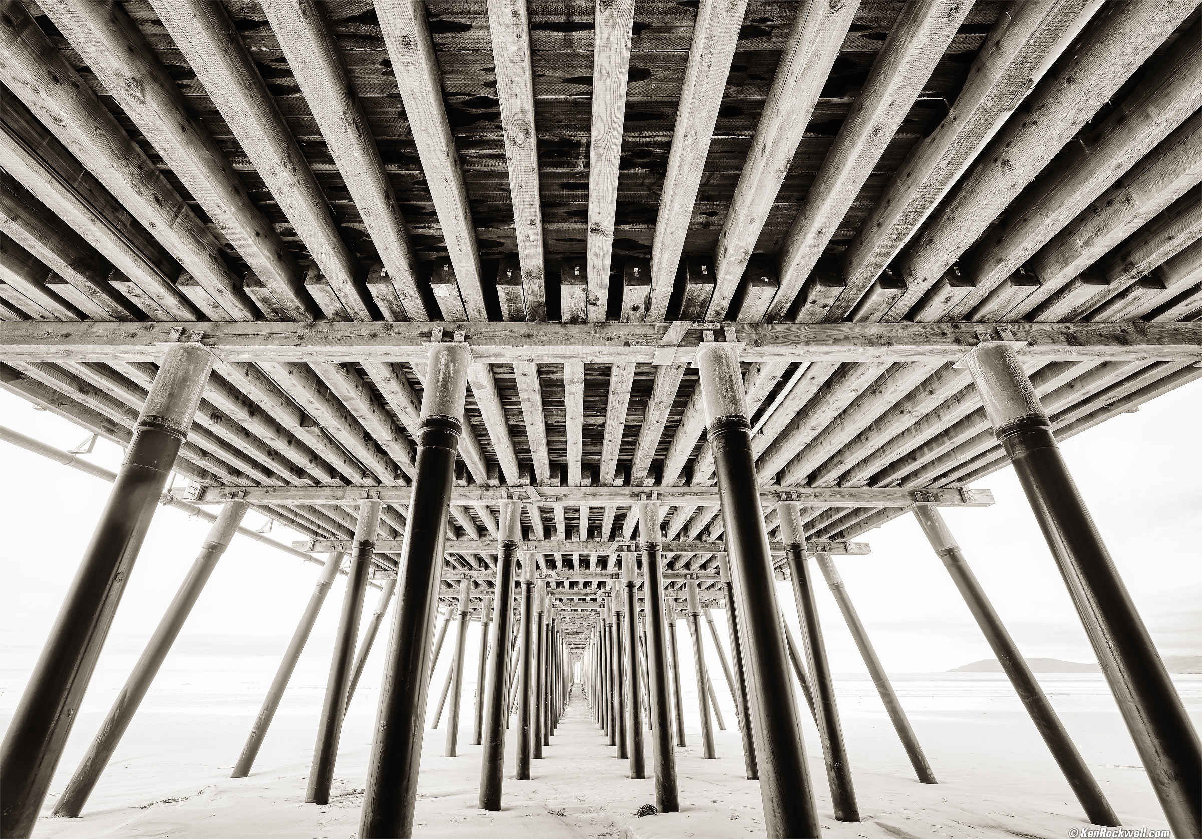 Under the Pier, Pismo Beach, California, 9:25 A.M., Thursday, 21 April 2022. Cropped a little from Nikon Z9, Oben CT-2491 Carbon-Fibre Tripod and matching Oben BC-139 Ball Head, Nikon Z 14-30mm f/4 at 14mm at f/8 at 1/8 at ISO 64 (LV 9⅔), Perfectly Clear and Skylum Aurora HDR (now part of Luminar Neo), split-toned-print. bigger or fit-to-screen.