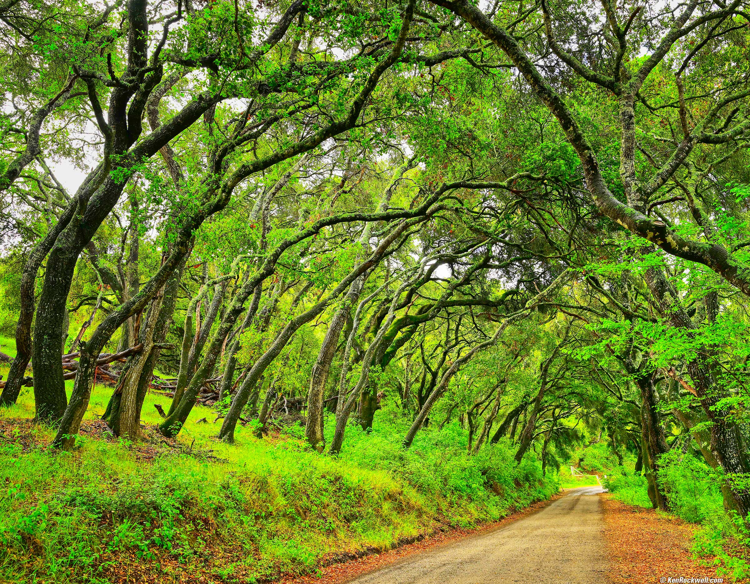 Spring Sprung under the Tree Tunnel, Irish Hills, San Luis Obispo, California, 9:32 A.M., Friday, 22 April 2022. Nikon Z9, Nikon Z 14-30mm f/4 at 24.5mm at f/8 hand-held at 1/25 at AUTO ISO 220 (LV 9½), Skylum Aurora HDR (now part of Luminar Neo). bigger or fit-to-screen.
