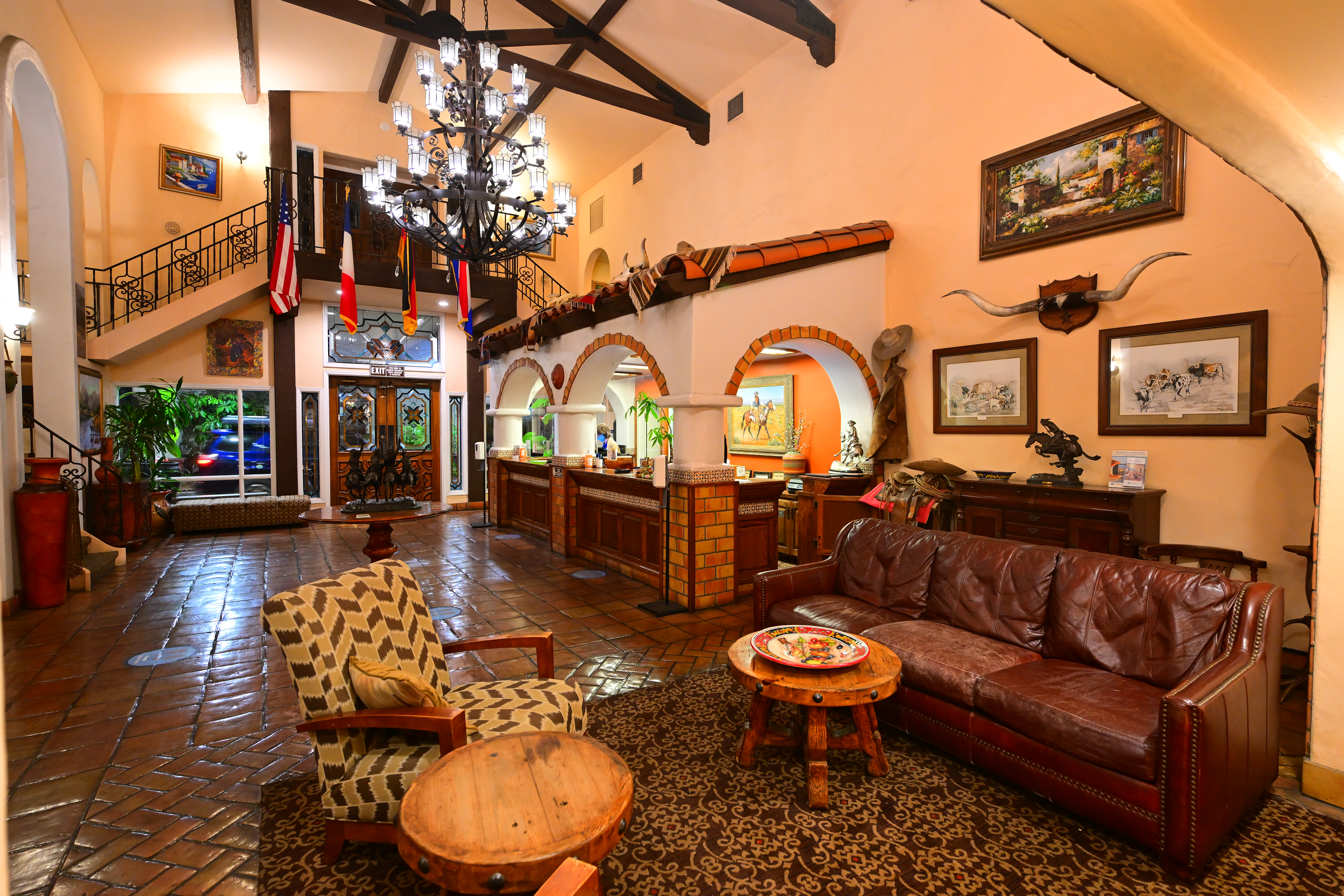 Best Western Casa Grande Lobby, Arroyo Grande, California, 9:48 P.M., Friday, 22 April 2022. Nikon Z9, Nikon Z 14-30mm f/4 at 16.5mm wide-open at f/4 hand-held at 1/15 at AUTO ISO 1,600, +0.7 stops exposure compensation (LV 3.9), Perfectly Clear, perspective correction in Photoshop CS6. bigger or camera-original 45 MP © 11 MB JPG.