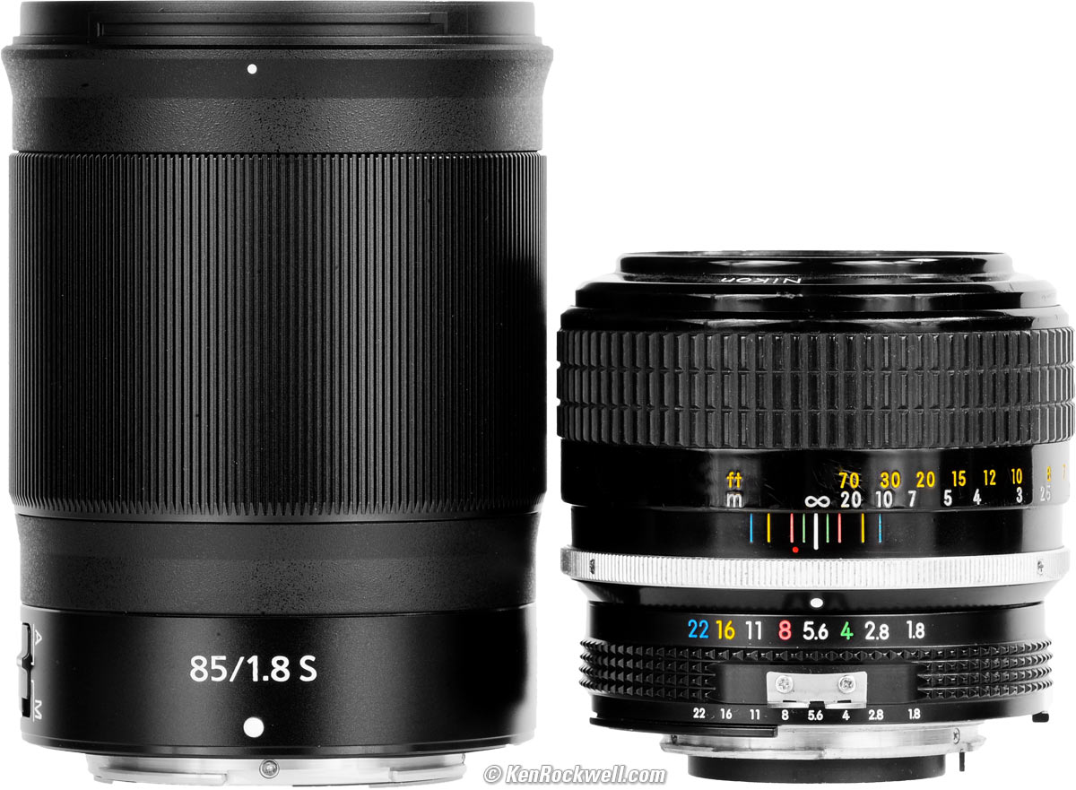 Versus Adapted Manual-Focus Lenses (1946 ~ today)Nikon Z 85mm f/1.8 (2019~) and 85mm f/1.8 AI (1964~1977). bigger or fit screen. Nikon's first 85mm f/2 came out in 1949 for its rangefinder cameras, and you can shoot that lens on your Z camera, and Nikon's first 85mm f/1.8 came out in 1964. There are many, many Nikon 85mm lenses. All of Nikon's 85mm lenses have always had excellent performance, even used today with adapters on Nikon's Z cameras. What makes this new Z 85/1.8 different is that it has even sharper performance in the laboratory in the corners wide-open at f/1.8 (all are equally sharp stopped down at normal apertures), and that of course this native Z lens autofocuses and interfaces best to the Z cameras; using old manual focus 85mm lenses leads to poorer metering and auto white balance due to the FTZ adapter's lack of coupling the lens' actual taking aperture to the camera. See the same sample images for comparison made with my 1976 85mm f/1.8 AI at it's review. Both images made at f/8 are just as insanely sharp at 45 megapixels, but the shots made with the older manual lenses are more purple in this case because auto white balance was fooled by all the green. Of course if you're crazy enough to shoot at f/1.8 in broad daylight and then look in the corners at large magnification the new lens is much sharper, too, but that's not that important: both are super sharp at f/1.8 in the center where it matters. Also remember that the 1984~1977 85mm f/1.8 was the softest 85mm ever made by Nikon for it's 35mm SLR cameras; the 85mm f/2 AI-s and 85mm f/1.4 AI-s are much better.