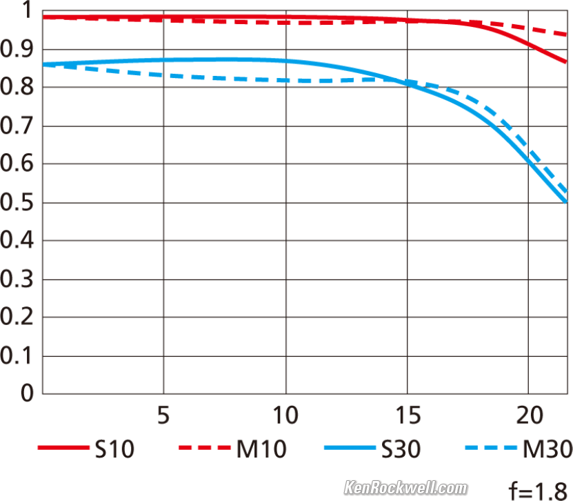 SharpnessLens sharpness has nothing to do with picture sharpness; every lens made in the past 100 years is more than sharp enough to make super-sharp pictures if you know what you're doing. The only limitation to picture sharpness is your skill as a photographer. It's the least talented who spend the most time worrying about lens sharpness and blame crummy pictures on their equipment rather than themselves. Skilled photographers make great images with whatever camera is in their hands; I've made some of my best images of all time with an irreparably broken camera! Most pixels are thrown away before you see them, but camera makers don't want you to know that. If you're not getting ultra-sharp pictures with this, be sure not to shoot at f/11 or smaller where all lenses are softer due to diffraction, always shoot at ISO 100 or below because cameras become softer at ISO 200 and above, avoid shooting across long distances over land which can lead to atmospheric heat shimmer, be sure everything is in perfect focus, set your camera's sharpening as you want it (I set mine to the maximum) and be sure nothing is moving, either camera or subject. If you want to ensure a soft image with any lens, shoot at f/22 at ISO 1,600 at default sharpening in daylight of subjects at differing distances in the same image. These cautions aside, this is an ultra-sharp lens especially wide-open at f/1.8 where most lenses are softer. At f/1.8 the corners are only the tiniest bit softer in the lab at 45MP but you won't notice this unless you're looking way too close in the lab. In most of the image, it's utrasharp even wide open at f/1.8! (remember in my Sample Images that the objects in the corner aren't necessarily in focus.) Nikon's MTF data agrees with what I see. These MTF curves look the same as the $5,000 ZEISS OTUS' MTF curves! Nikon's MTF chart at 10 cyc/mm and 30 cyc/mm.