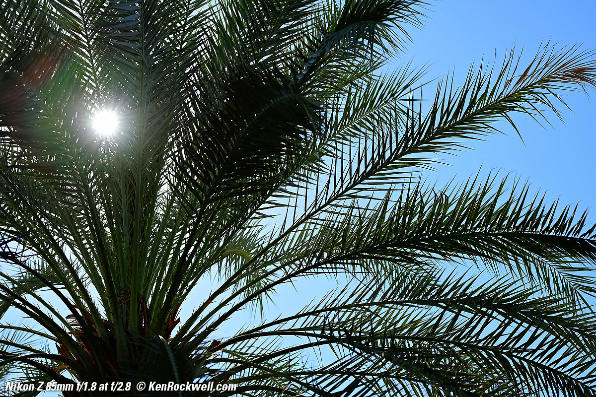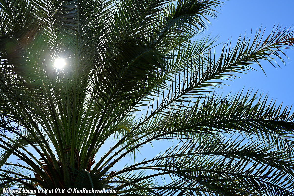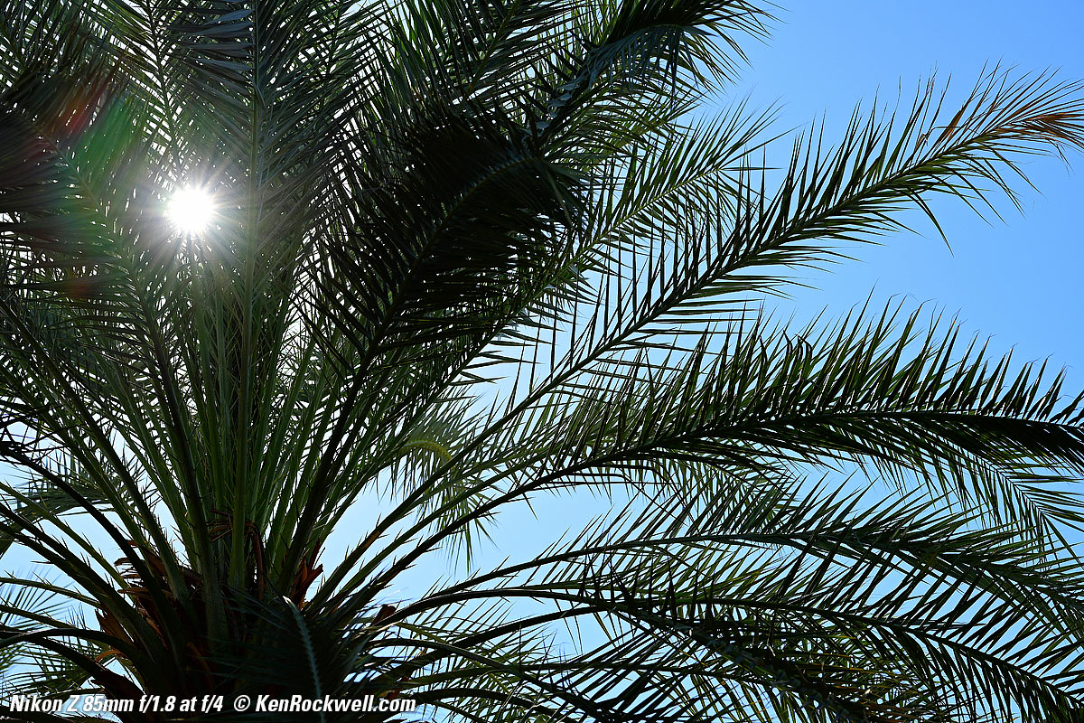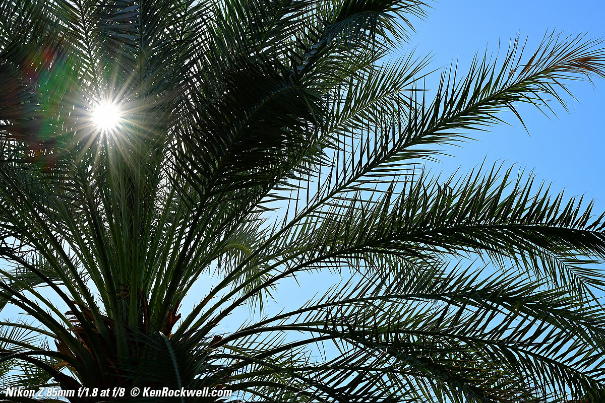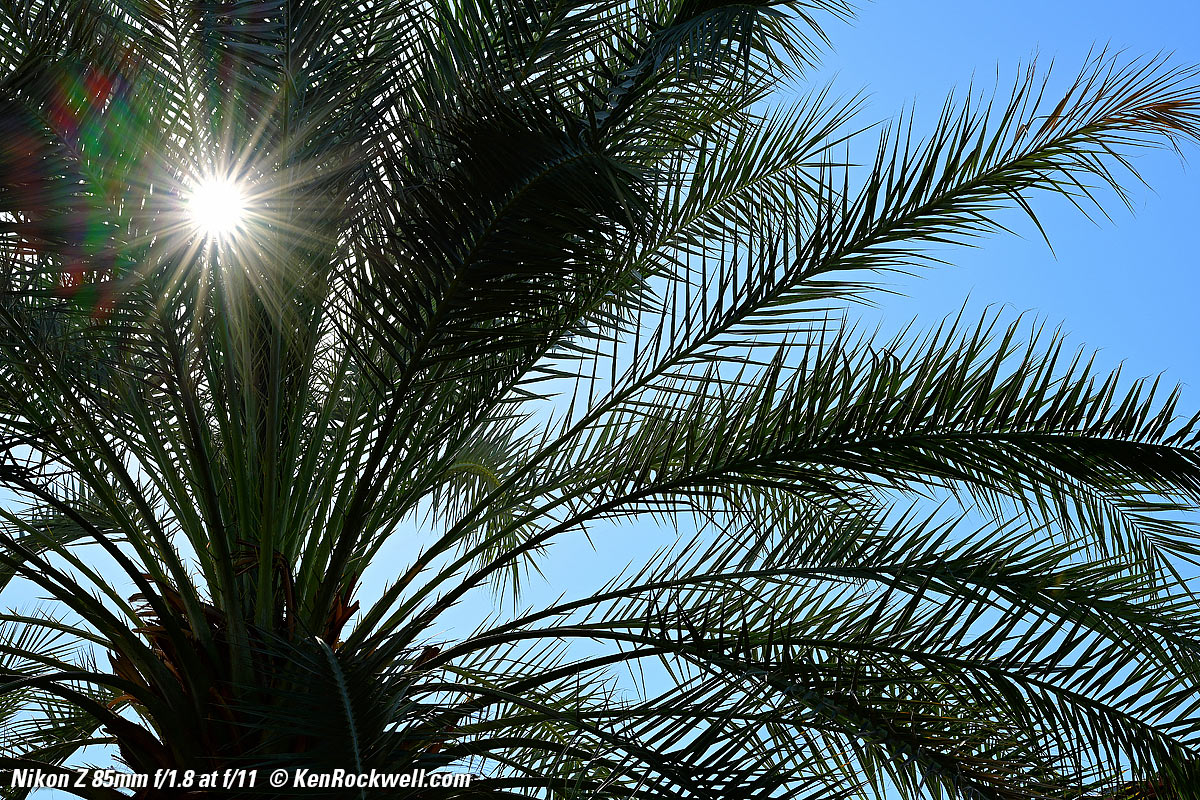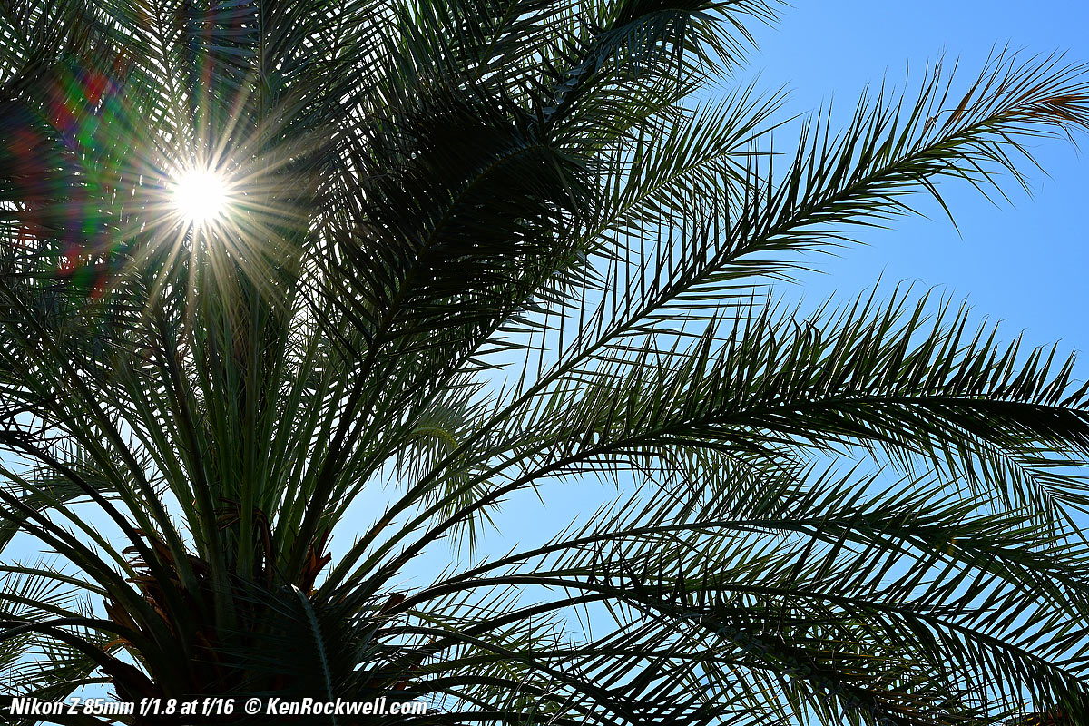 SunstarsWith a 9-bladed rounded diaphragm, I get pretty good 18-pointed sunstars on brilliant points of light at the smaller apertures. Ignore the crazy rainbow effects at the smallest apertures; these are sensor artifacts caused by taking a picture directly of the sun and exposing for the dark underside of the palm tree. Click any to enlarge: Click any to enlarge. Ignore the crazy rainbow effects at the smallest apertures; these are sensor artifacts caused by taking a picture directly of the sun and exposing for the dark underside of the palm tree.