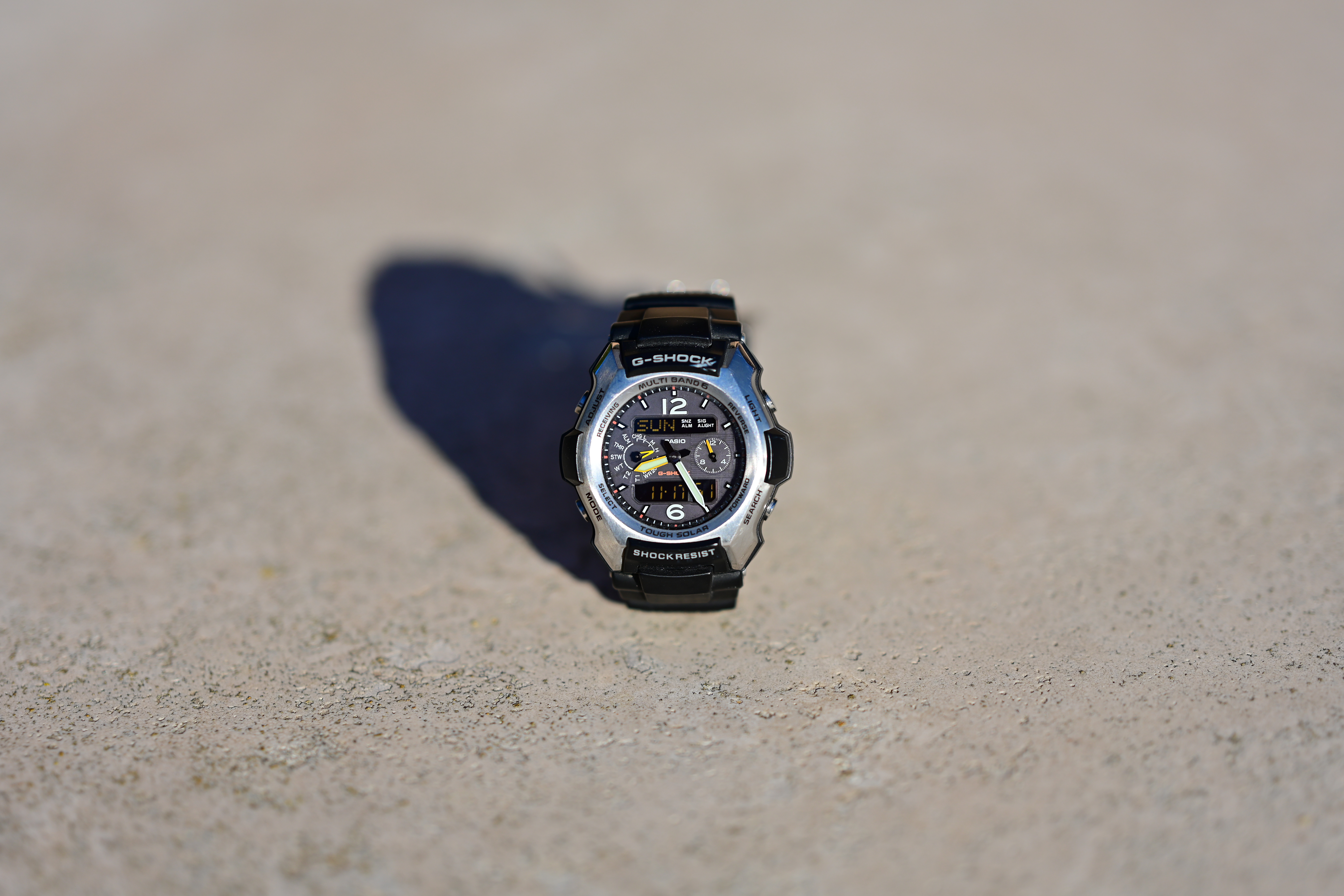 Macro PerformanceMacro gets about as close as most traditional 85mm lenses (1:8.3 or 0.12×), and it stays sharp and contrasty even at f/1.8. Remember there is zero depth of field at macro distances at f/1.8, which is why even though the watch face is in focus, neither the hands nor bezel are. The slight color fringes are spherochromatism and only are indicative of areas that aren't in perfect focus; the face isn't even straight-on to the camera in this hand-held shot: Sadly with all this optical innovation and fancy multifocus system it still doesn't focus any closer than any other regular Nikon 85mm SLR lens, and still doesn't focus significantly closer than Nikon's first 85mm f/2 rangefinder lens did 70 years ago! Casio G-Shock Solar Atomic Watch at close-focus distance, 17 November 2019. Shot on Nikon Z7 at f/1.8 at 1/4,000 at ISO 64 (LV 14.3). bigger or camera-original © file.