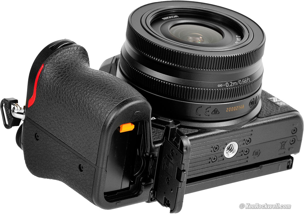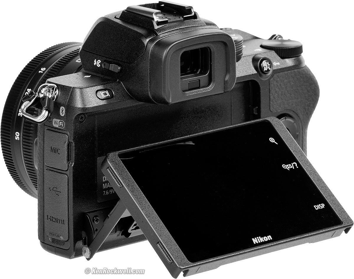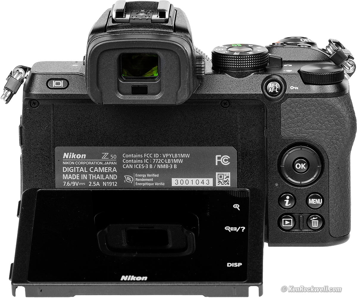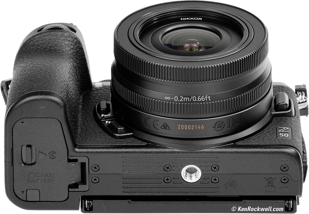 ErgonomicsMy Z50 feels and handles great. There are a couple of things that bug me about the Z7 and Z6 which don't about the Z50; the Z50 just shoots and gets out of my way. All the shooting and playback buttons and dials are on the right side for one-handed shooting, a huge improvement over the Z7 and Z6. I love that the Z50's mode dial just works; there is no lock in my way that requires two hands as does the mode dial of the Z7 and Z6. The mode and rear control dials of the Z50 are plastic and much more comfortable than the hard metal dials of the Z7 and Z6. Everything tends to default to being just right; all the things that drive me up the wall with lesser cameras like Sony and Fuji just aren't a problem with the Z50; with my Z50 I just shoot and great great results without having to argue with my camera that's supposed to be serving me. The touch screen works great, it's even easy to enter text. Nikon Z50 and collapsed Nikon Z 16-50mm DX VR. bigger. The SD card goes into a slot between the battery and the door hinge, making it hard to push to get it to pop out. One annoying thing I never bothered to figure out is that it often takes a picture if you tap the LCD just the right way. The three +, -, and DISP touch controls on the right of the rear LCD are the worst thing about the Z50. If I'm looking at the LCD they are easy to find in daylight, but impossible to find by feel as I'm shooting with my eye to the finder. Thus it's difficult to adjust magnification as you're shooting: +, - and DISP "buttons" on the touch screen. bigger. These are but minor whines; overall, it handles so much better than anything from Sony or Fuji or even the Nikon Z7 or Z6. Bravo!