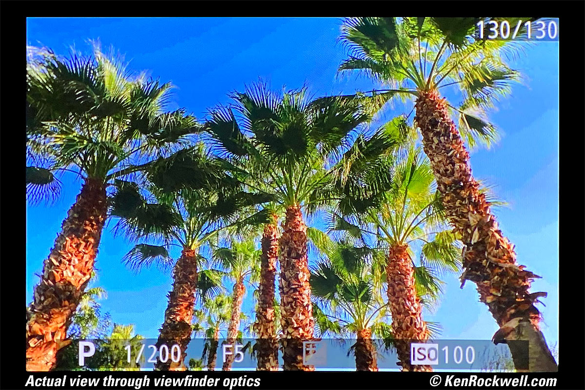 FinderActual view through finder optics. bigger. It's a lot sharper in actual use. The electronic OLED finder is great. Auto brightness control works very well, although it's still mostly responding to light coming in the front of the lens. For the first time ever the finder just looks so good that it reminds me of Velvia slides on a light box! While it looks great, the optics are about the same as all midline cameras. The finder optics are OK, but not exactly like the much larger and more exotic eyepieces you'll find on a pair of LEICA binoculars. While the OLED electronic viewfinder screen has a 4:3 aspect ratio so data can fit above and below the 3:2 aspect-ratio camera image, oddly a zoomed image never fills the screen — even if there is no data above or below. One weird Nikon core incompetancy is blue banding in playback images. Most modern Nikons do this, as seen both on the rear LCD or in the finder: Actual view of in-finder playback. bigger. This comes from the lower-resolution and more compressed thumbnail images encoded - and read - by the camera's playback electronics when you're looking at the complete image. Don't worry, this banding is not in your actual picture and goes away if you zoom-in, in which case the camera reads the complete image without the banding. I almost never see this, but I know someone will and blow it all out of proportion. Again, the Nikon Z50 finder is probably the best looking finder I've ever used. My images look great on it, vibrant and colorful in every kind of light.