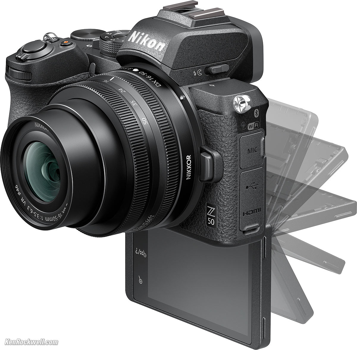 Nikon Z50 flipping LCD. bigger. 3.2" (80mm) diagonal. 1.040,000 dots. Swivels down 180º No auto-brightness control (manual settings only).