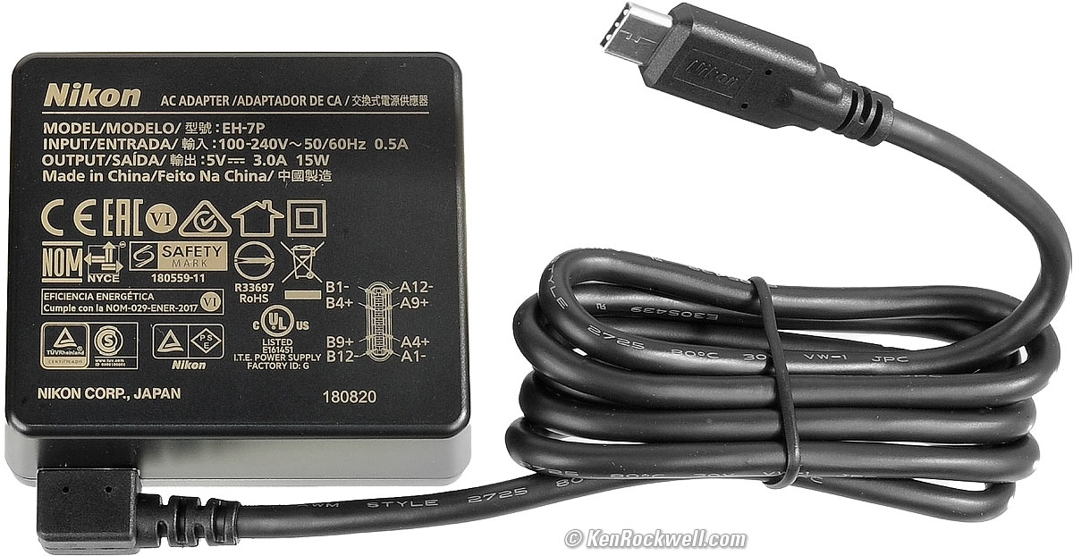 ChargingCharge in-camera over USB. An EH-7P Charging AC Adapter is included, which can power the camera directly or charge the newest EN-EL15c or older EN-EL15b batteries in-camera. Nikon doesn't claim that this adapter will power the camera on its own and simply says it will "greatly extend the battery life." Included Folding-Plug EH-7P Charging AC Adapter for Nikon Z7 II. bigger.