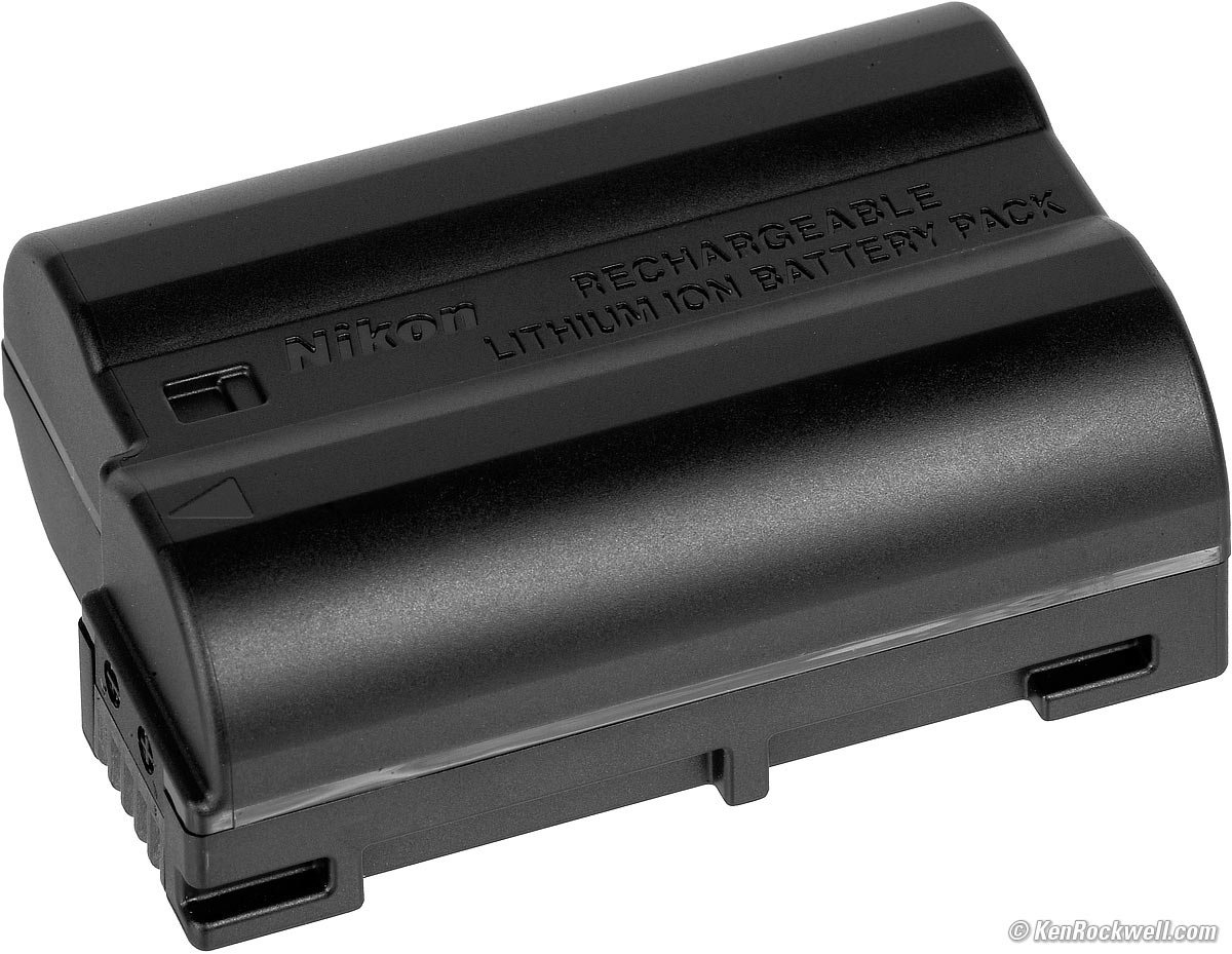 Bottom, Nikon MH-25a charger. enlarge. The extra MH-25A external battery charger charges any of the EN-EL15, EN-EL15a, EN-EL15b and EN-EL15c Li-Ion batteries. The MH-25a charger has been used for years. It has a bizarre flipping socket which requires either an awkward short US plug, or a standard "figure-8" charger cord. The charger is clumsy, requires you slip the battery into the hole instead of popping it in from the top like most good chargers, and is useless unless you also bring a cord or plug. The charge light is Nikon's standard. It blinks slowly while charging and goes solid when done. There is no indication of charge percentage while charging.