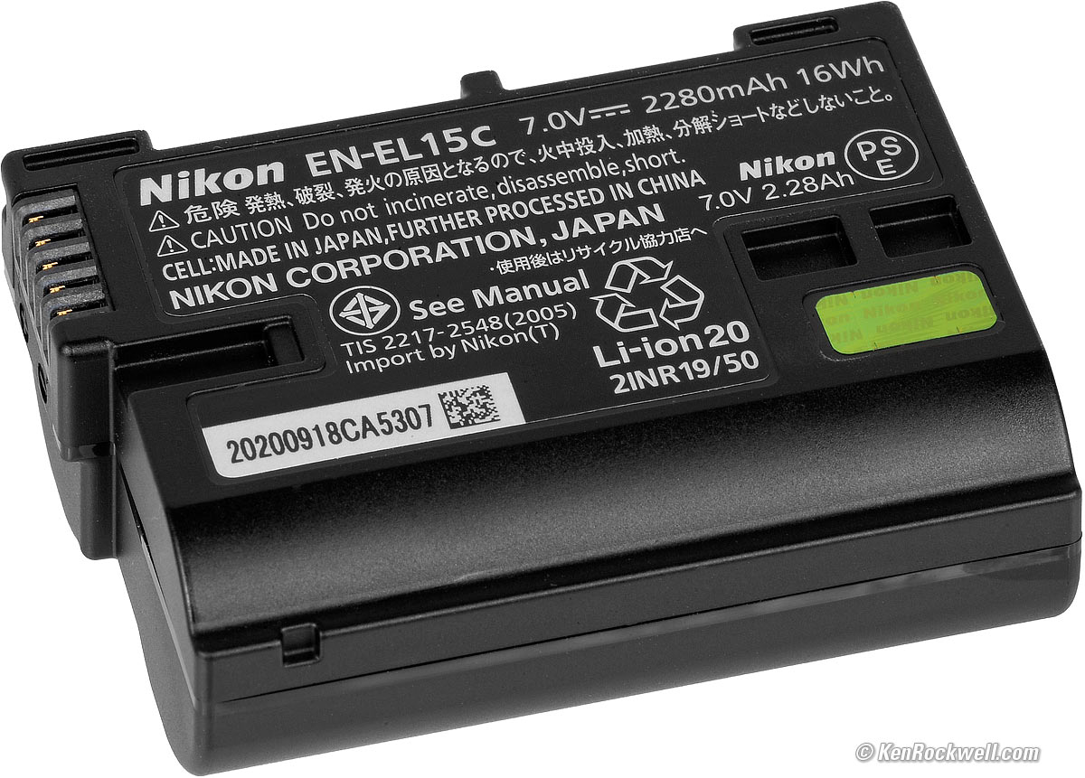 New EN-EL15c battery has a little more capacity than the older EN-EL15, EN-EL15a and EN-EL15b batteries. 7.0V, 2,280 mAh, or 16 Wh. 1.6 × 2.2 × 0.8 inches (40 × 56 × 20.5 mm). 2.9 ounces (80g).No rated shot capacity. I get about 600 shots per charge in general walking-around shooting.