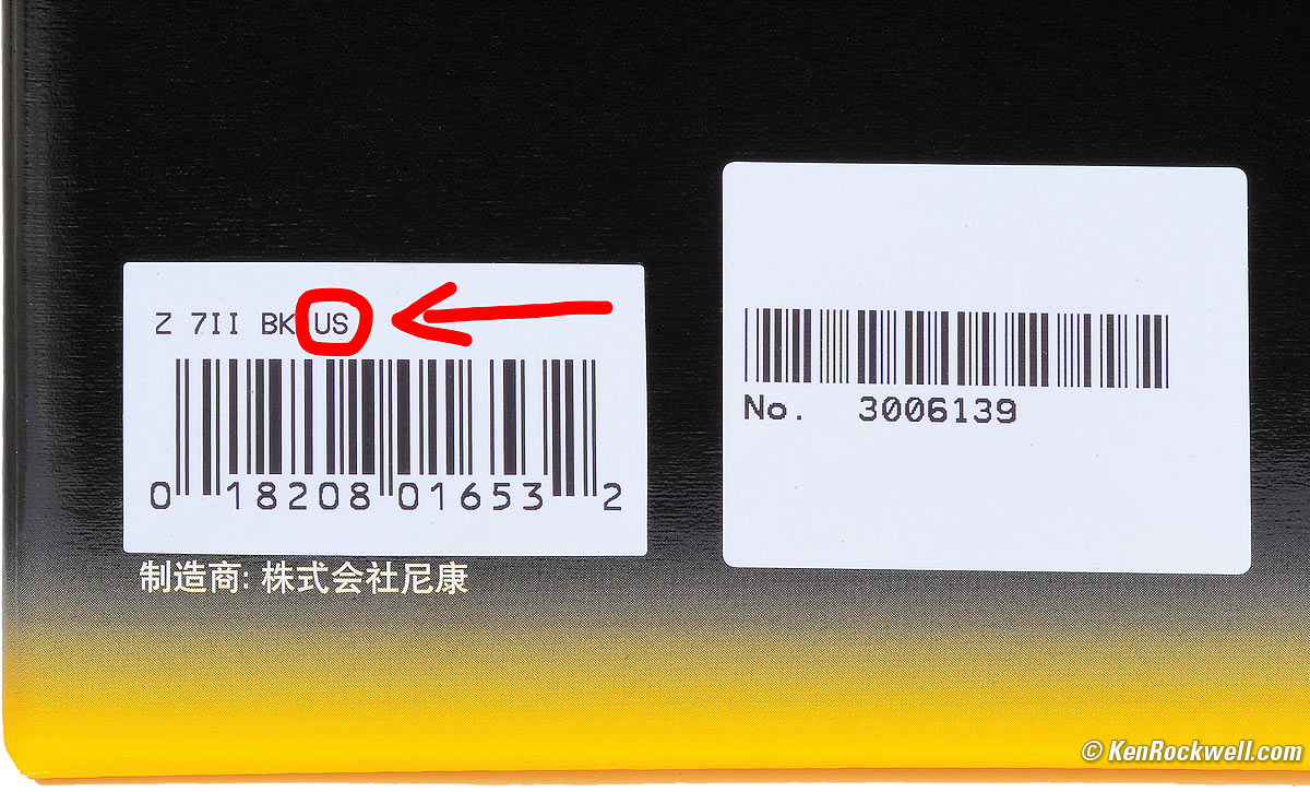 This section applies in the U. S. A. only. Your box should have "US" on the UPC sticker by the model number (BK means black): Box side with UPC & Serial Number Stickers, Nikon Z7 II. bigger.