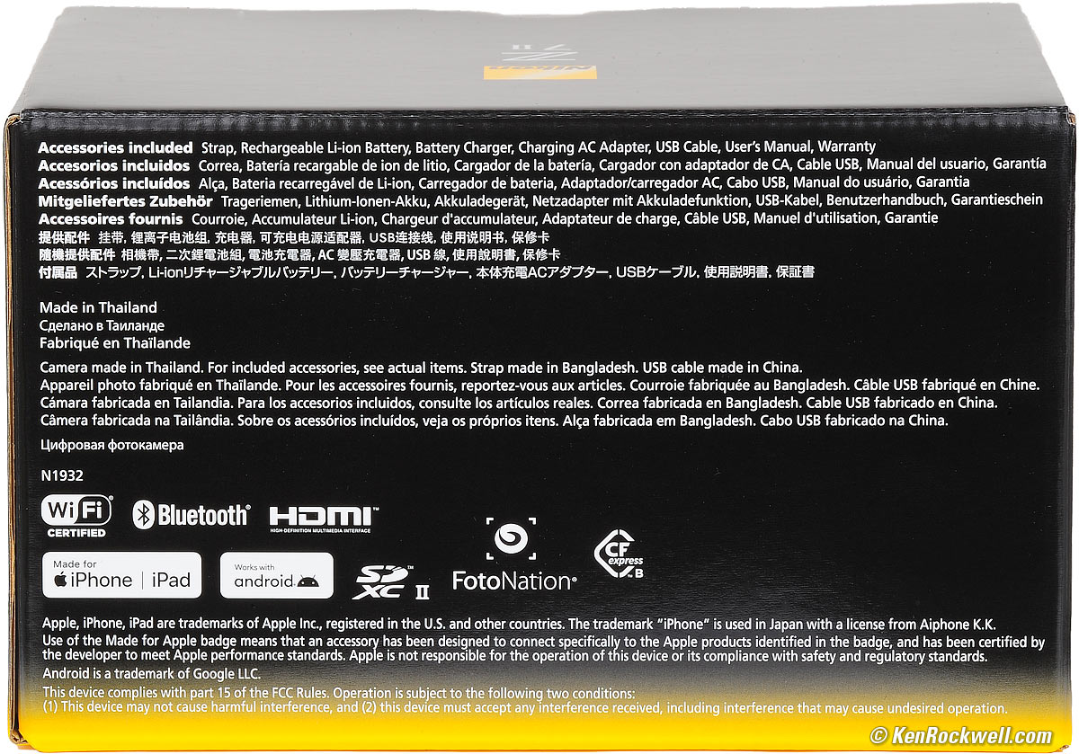This all-content, junk-free website's biggest source of support is when you use those or any of these links to approved sources when you get anything, regardless of the country in which you live. Nikon does not seal its boxes in any way, so never buy at retail or any other source not on my personally approved list since you'll have no way of knowing if you're missing accessories, getting a defective, damaged, returned, non-USA, store demo or used camera. I use the stores I do because they ship from secure remote warehouses where no one gets to touch your new camera before you do. Buy only from the approved sources I use myself for the best prices, service, return policies and selection. Thanks for helping me help you! Ken Rockwell.