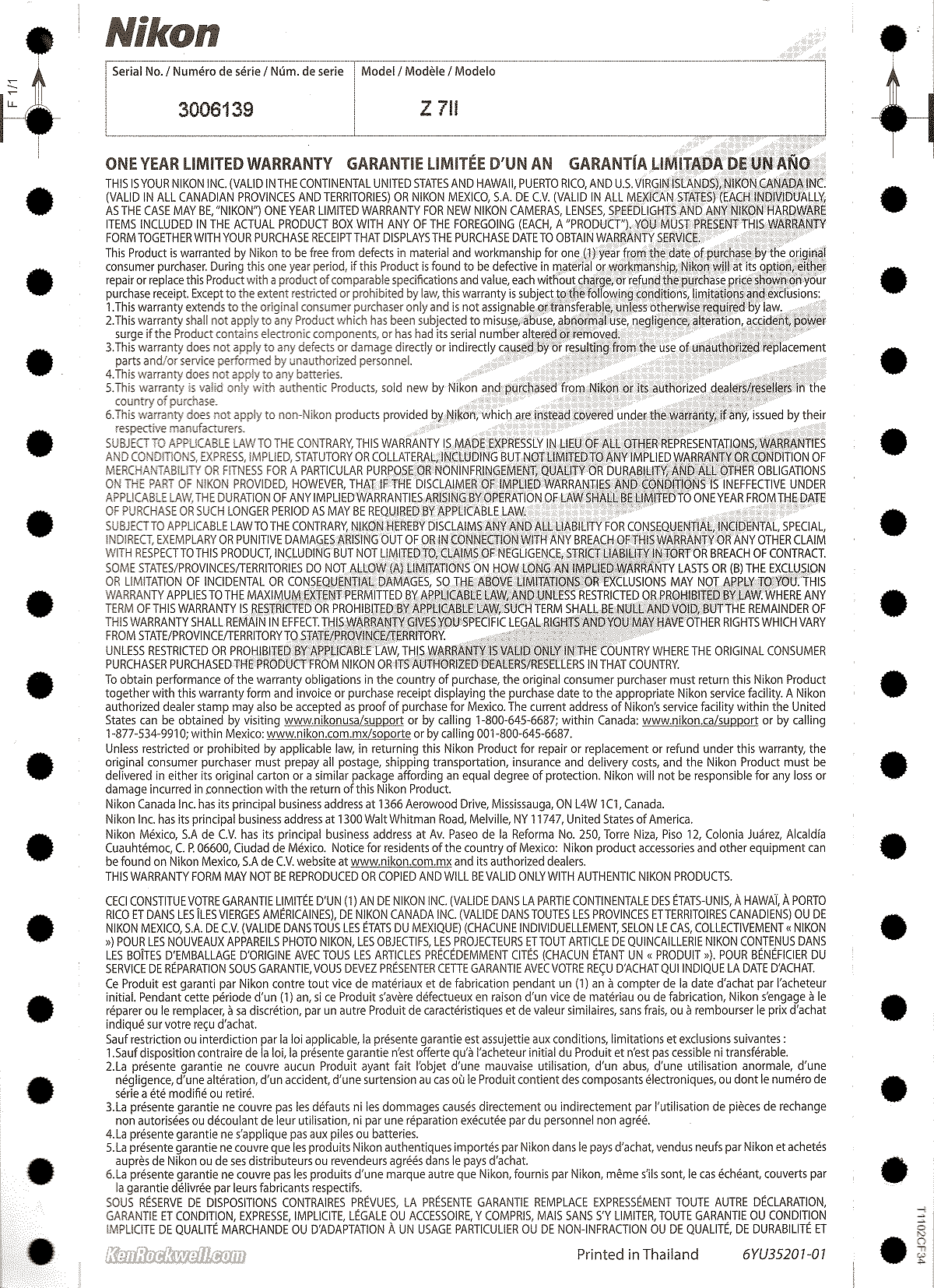 Most importantly you need a USA Warranty Card, and the serial number must match the one on the back of your camera, otherwise you have no warranty. Nikon Z7 II USA Warranty Card. bigger. If you don't have this card, if the card doesn't say "VALID IN THE CONTINENTAL UNITED STATES" or the serial number on the card doesn't match the one on your camera exactly, you got ripped off with a gray market version from another country. All legitimate cameras come with printed warranty cards, even if you prefer to register online. (The serial number on the box doesn't have to match, but if it doesn't it means you bought from a shady dealer who took cameras out of boxes and then resold them as new.) Did you notice the clever nod to ancient computer technology? This is printed on tractor-fed paper with tear-off sides and dot-matrix printing of model and serial numbers! If your card lacks these side perforations, beware. Everyone counterfeits laser holograms, but few people have dot-matix printers floating around to trey to fake these. Always be sure to check your box, warranty card and serial numbers while you can still return it, or just don't buy from unapproved sources or at retail so you'll be able to have your camera serviced and get free updated firmware as needed. This is why I never buy anyplace other than from my personally approved sources. You just can't take the chance of buying elsewhere, especially at any retail store, because non-USA versions have no warranty in the U. S. A., and you won't even be able to get firmware or service for it — even if you're willing to pay out-of-pocket for it when you need it! Nikon U. S. A. enforces its trademarks strictly. It's unlikely, but possible that US customs won't let your camera back in the country if you bought a gray-market version in the U. S. A., carried it overseas, and try to bring it back in. (If you take the chance of buying one overseas, be sure you have a receipt to prove you bought it overseas and be prepared to pay duty on it.) If a gray market version saves you $1,000 it may be worth it, but for $200 or less I wouldn't risk having no warranty or support. U. S. A. versions include two small, 56-page printed manuals, one in English y uno en español. Get yours from the same places I do and you won't have a problem, but if you take the risk of getting yours elsewhere, be sure to check everything while you still can return it.