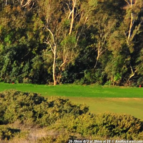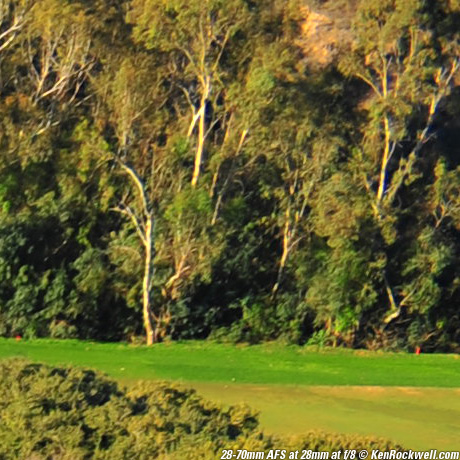 Tech I used Manual exposure, a tripod and fixed (direct sun) WB, D3, 100 ISO. I saved all the crops from Photoshop as Save For Web, 80% quality, which has no loss in visual quality. Heck, even at 40% I rarely can see any difference. When I first ran these, the 28-70mm looked hideous at 50mm and 70mm. I tried again, and it still looked awful. On my sample of D3 with the sample of 28-70mm I was loaned, I needed to dial in -15 in the AF Fine Tune menu (second to last in the wrench menu) to fix this. Now the results at 28mm and 35mm were also a little out of focus instead. I therefore used the best (uncorrected) examples at 28mm and 35mm for the 28-70mm, and the corrected examples at 50mm and 70mm. This is cheating! It's why you'll see the light looks a little different on the 50mm and 70mm shots with the 28-70mm, since they were made the next day at the same time. It also gives the 28-70mm an advantage I didn't afford the other lenses. Tough, I spent over a week of my life on this comparison and cannot devote another three weeks to try every possible combination. If you want to see the 28-70mm on the same level as the others, it is shot under the same conditions at 28mm and 35mm, but know that the results at 50mm and 70mm were far inferior to any other lens before I added the correction. Your results with the 28-70mm will be different, so I won't sweat this unless I hear other stories of consistent AF errors with the 28-70mm. 24mm 24mm 28mm 35mm 50mm 70mm top Since the only lens that covers 24mm is the 24-70mm f/2.8 AF-S, I'll show it's performance at each aperture right here.
