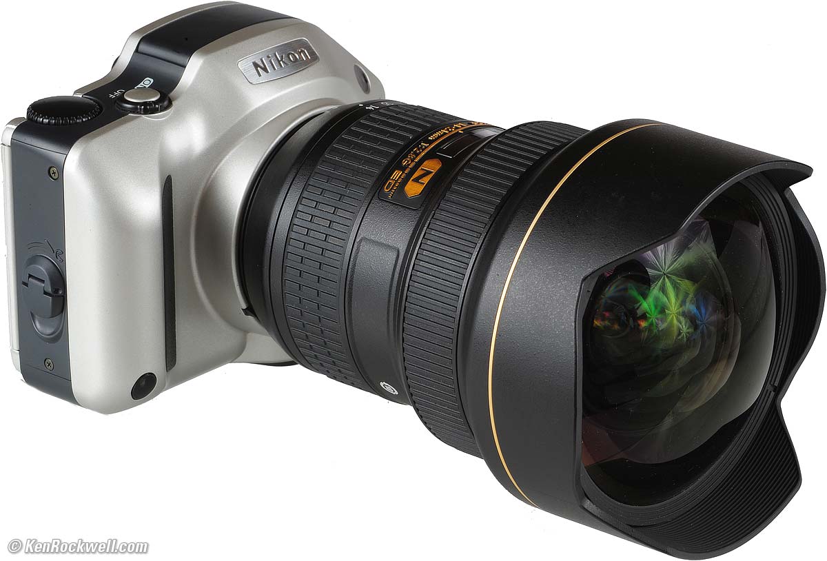 Rear, Pronea S. APS Brush-up APS is a dead film format from the late 1990s. APS is a little smaller than 35mm film, but a little bigger than Nikon DX or Canon 1.6x cameras. The full APS-H frame is 30.2 x 16.7mm. The shapes don't match, but comparing diagonals, APS-H has a 1.254x crop factor. The side-cropped APS-C frame is 25.1 x 16.7mm. APS-C has a 1.435x crop factor. See my APS page for details and for the dimensions of the various APS frames. Lens Compatibility The Nikon Pronea S works perfectly with the 14-24mm f/2.8 AF-S. enlarge. Much to my surprise, this APS camera works with all my Nikon lenses, even DX! It works perfectly with all FX, DX, AF, AF-D, AF-I and AF-S lenses, as well as the crappy IX-Nikkor lenses of the late 1990s. The only gotcha is that the Pronea won't drive vibration reduction (VR). Nikon is great when it comes to compatibly. The Pronea S is mentioned In the manuals for the newest 105mm VR Micro and 200-400mm VR. Nikon warns that you ought to keep VR turned OFF on the lens, since leaving it ON won't get you VR, but will run down the batteries of the Pronea S. Oddly, Nikon's VR doesn't work, but a reader writes that her Sigma's OS stabilizer did work. APS is a little bigger than DX. One pleasant surprise is that I can use my 12-24mm DX for even wider shots that I can get on DX digital! Even at 12mm, I fill the entire APS-H (30.2 x 16.7mm) frame with only the slightest vignetting. Be sure to run the 12-24mm without any filters. |