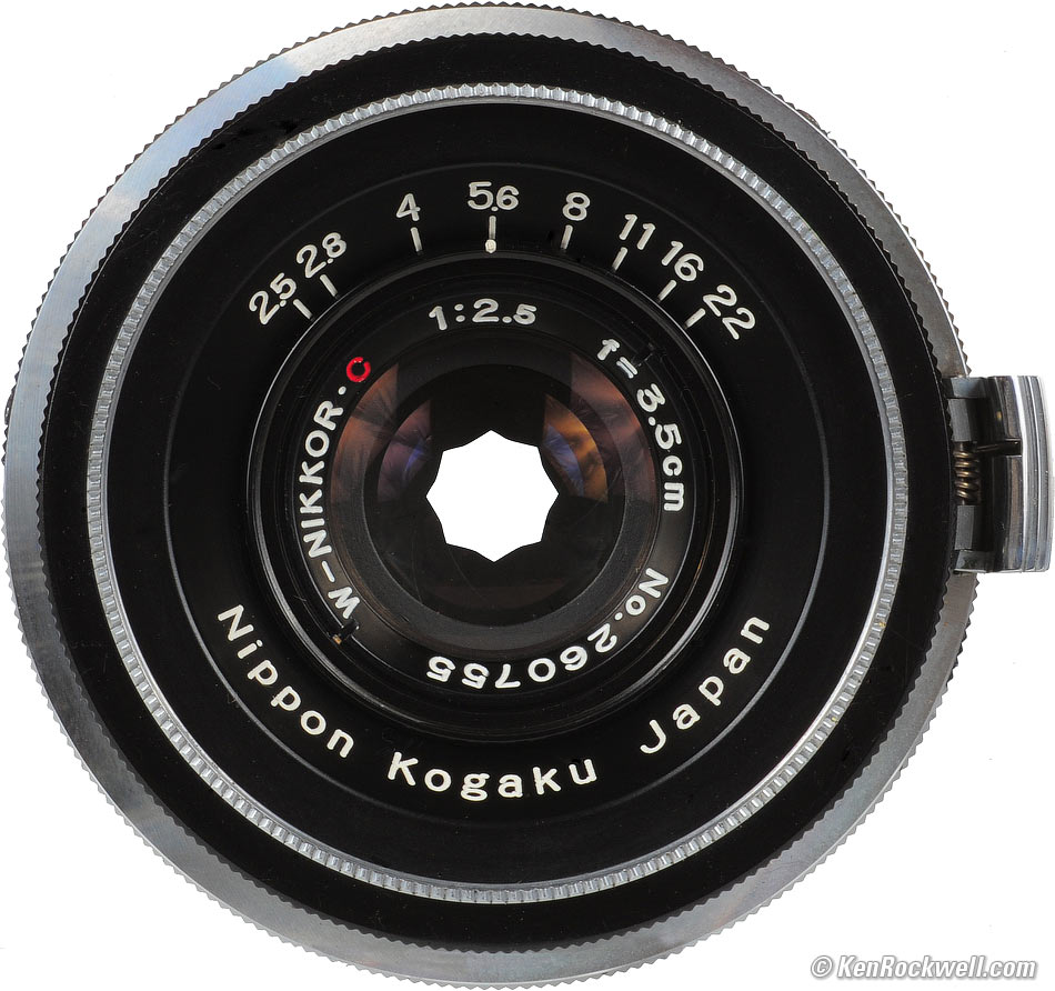 Intro Specs Performance Usage Recommendations The Nikon W-NIKKOR·C 3.5cm f/2.5 (35mm f/2.5) was a popular wide-angle lens for Nikon's 1950s rangefinder cameras. This old lens' performance can exceed modern SLR lenses. This is because rangefinder lenses are designed without the compromise of having to avoid the flipping SLR mirror. Rangefinder lenses can get much closer to the film if the designer wants them to. This 3.5cm lens is one of the good ones that was over-designed for its era, so it still performs wonderfully today. It's a tiny lens: the size of a slightly flattened golf ball weighing under 4 oz. (111g)!