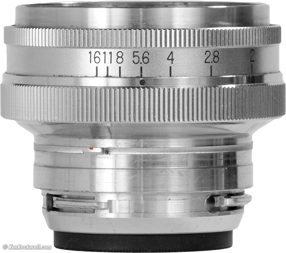 Nikon 5cm (50mm) f/2, actual size at 106 DPI. enlarge. The Nikon 5cm (50mm) f/2's ergonomics are a little better than the f/1.4 because there is a little more spacing between the smaller apertures. Except for setting the aperture, this lens is about as passive as a golf ball; it doesn't even have its own focus mechanism! It's simply an optical tube that mounts into the Nikon rangefinder camera bodies. The aperture ring of this particular cosmetic variation is matte chrome, which is easy to read in any light, however the black index dot is on bright chrome, and therefore usually invisible in any light.