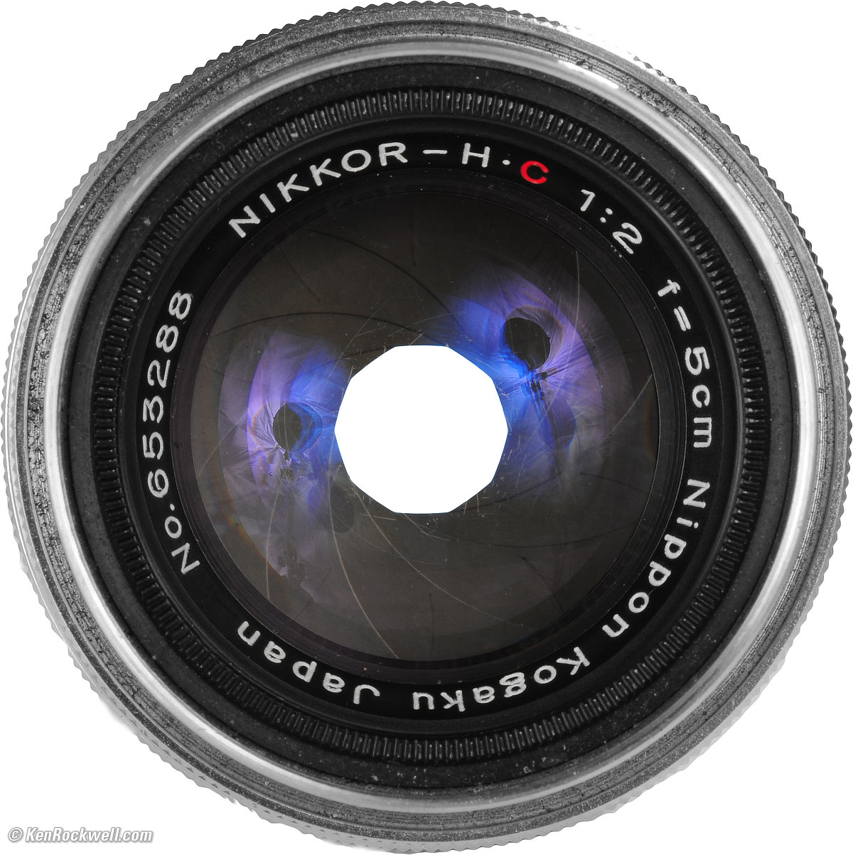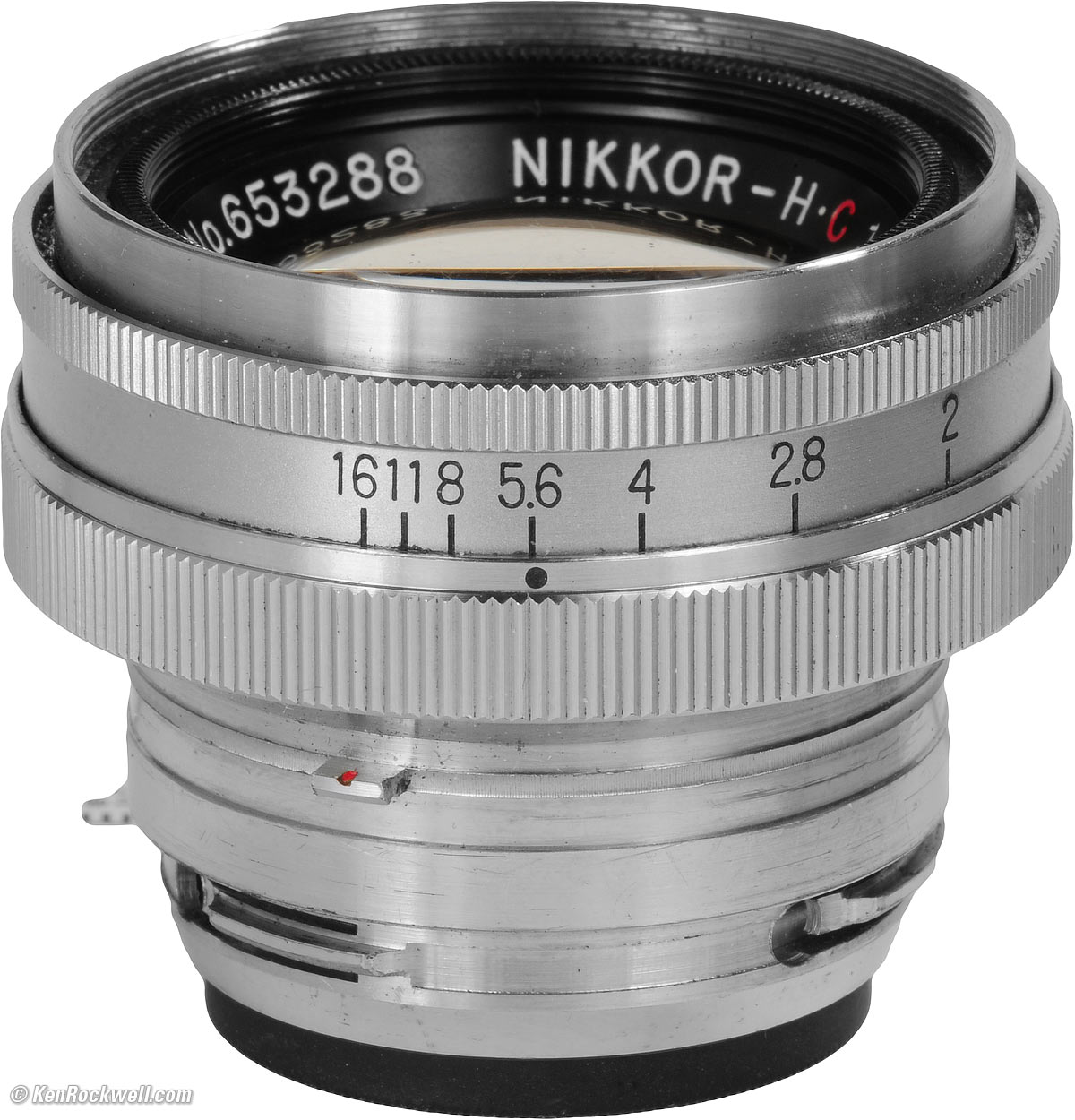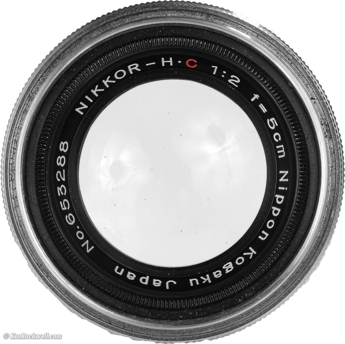 Name Nikon calls this the NIKKOR-H•C 5cm f/2. NIKKOR is Nikon's trademark for its lenses. H stands for "hex," meaning this lens has six elements. C means coated, which was a competitive advantage for Nikon in the 1940s, but as all other brands of lenses were coated by 1957, Nikon dropped the C. 5cm means 50mm.