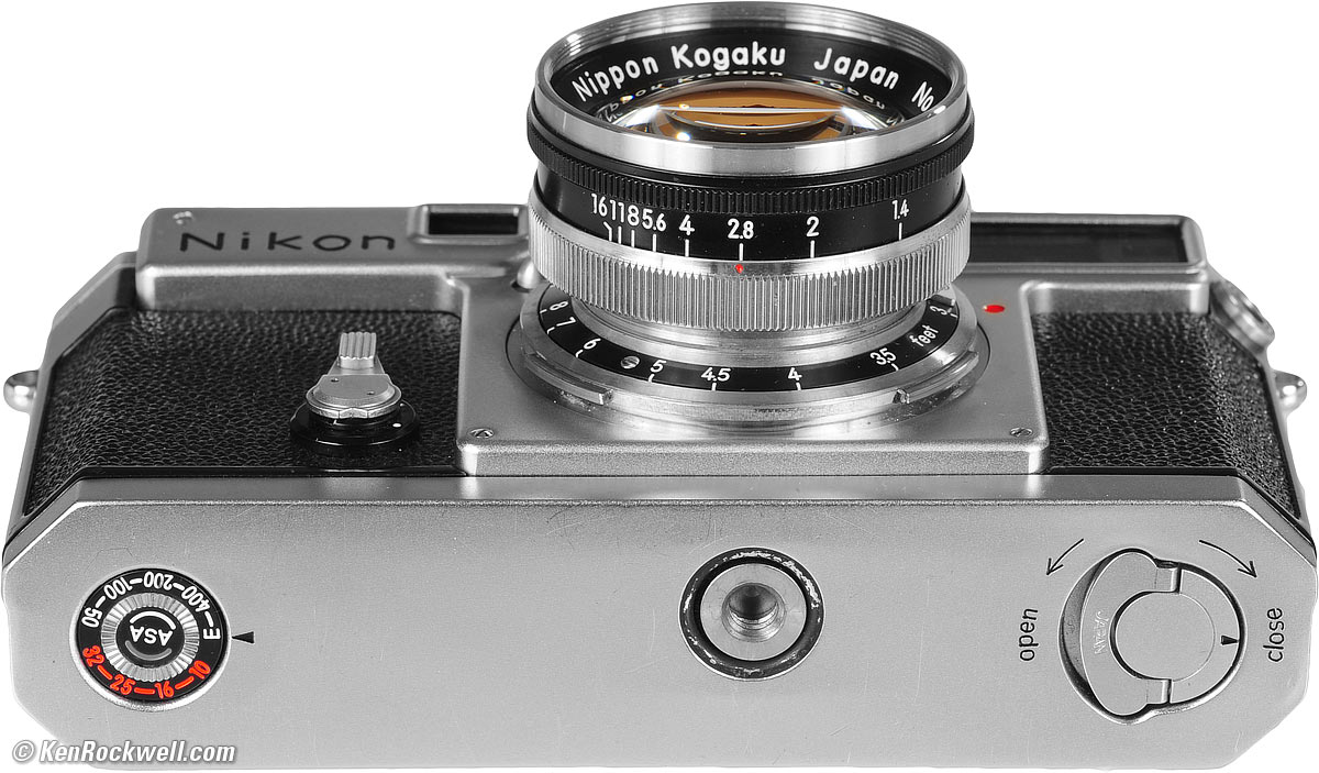 Top, Nikon SP and NIKKOR-S 5cm f/1.4. enlarge. The Nikon SP does not select finder frames automatically, as do all LEICA M kameras. For lenses of 50mm and longer, select the frameline manually with the dial that surrounds the rewind crank. It's marked in centimeters, not millimeters, thus 5 = 50mm, etc.