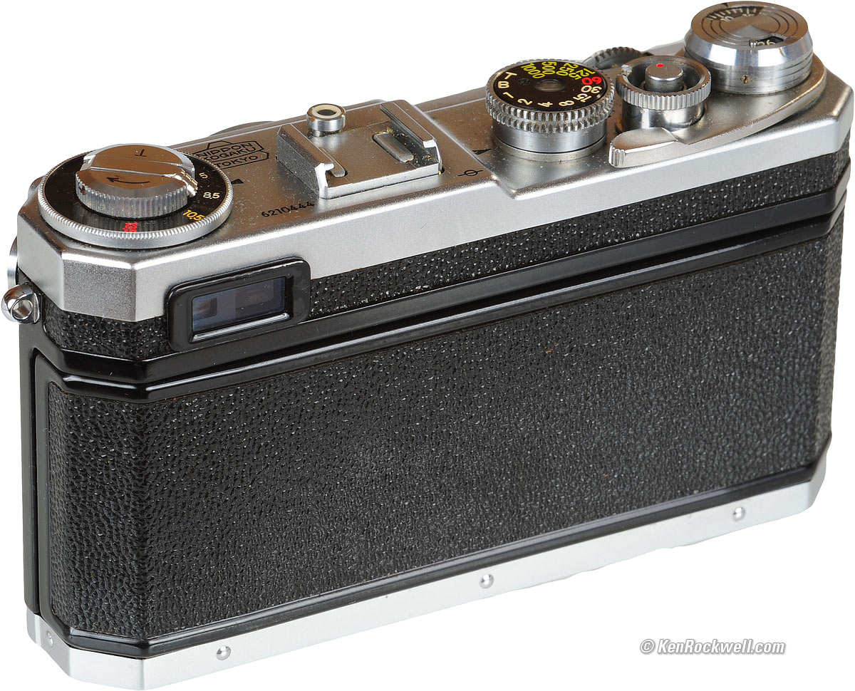 1959 Nikon replaced the Nikon's SP's original Habutae silk shutter with the same titanium shutter it used in the 1959 Nikon F. Believe it or not, Nikon's first SLR, the Nikon F of 1959, is actually just a Nikon SP with a prism glommed on! The shutter, layout, controls, and camera back are all otherwise the same between this Nikon SP and the Nikon F SLR. NIkon turned this grafted-on prism kludge into a marketing ploy that worked all the way up to 1999, when the Nikon D1 was Nikon's first-ever professional SLR that didn't have an interchangeable prism! Even the SP's removable back is the same in the Nikon F, except that the Nikon F is a little bit wider, but otherwise identical.