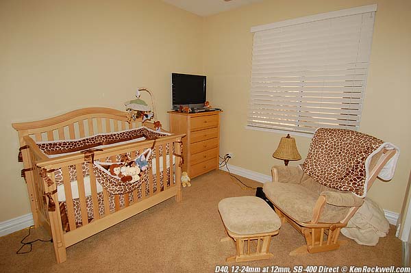 Angle of Coverage18mm (digital camera), 28mm (F6), rated. There is no zoom and there is no additional wide diffuser. It doesn't need them, either. The Japanese rate coverage for people shooting single blank walls. In the real world indoors, the side walls and ceilings are closer to you, so they need less light at the side, and thus most flashes work great even with ultra wide lenses. My SB-400 works great with my 12-24mm lens even at 12mm, with no shadows at the bottom! This is one of the main reasons I bought my SB-400: so I don't need to haul my SB-600 just for fill with my ultrawides. Built-in flashes are too close to the lens so they cast a dark shadow in the center bottom of the image. No problems with the SB-400! Coverage at 12mm on my D40. Roll mouse over to compare SB-400 to built-in flash. Let's push our luck with a 10.5mm Fisheye lens.