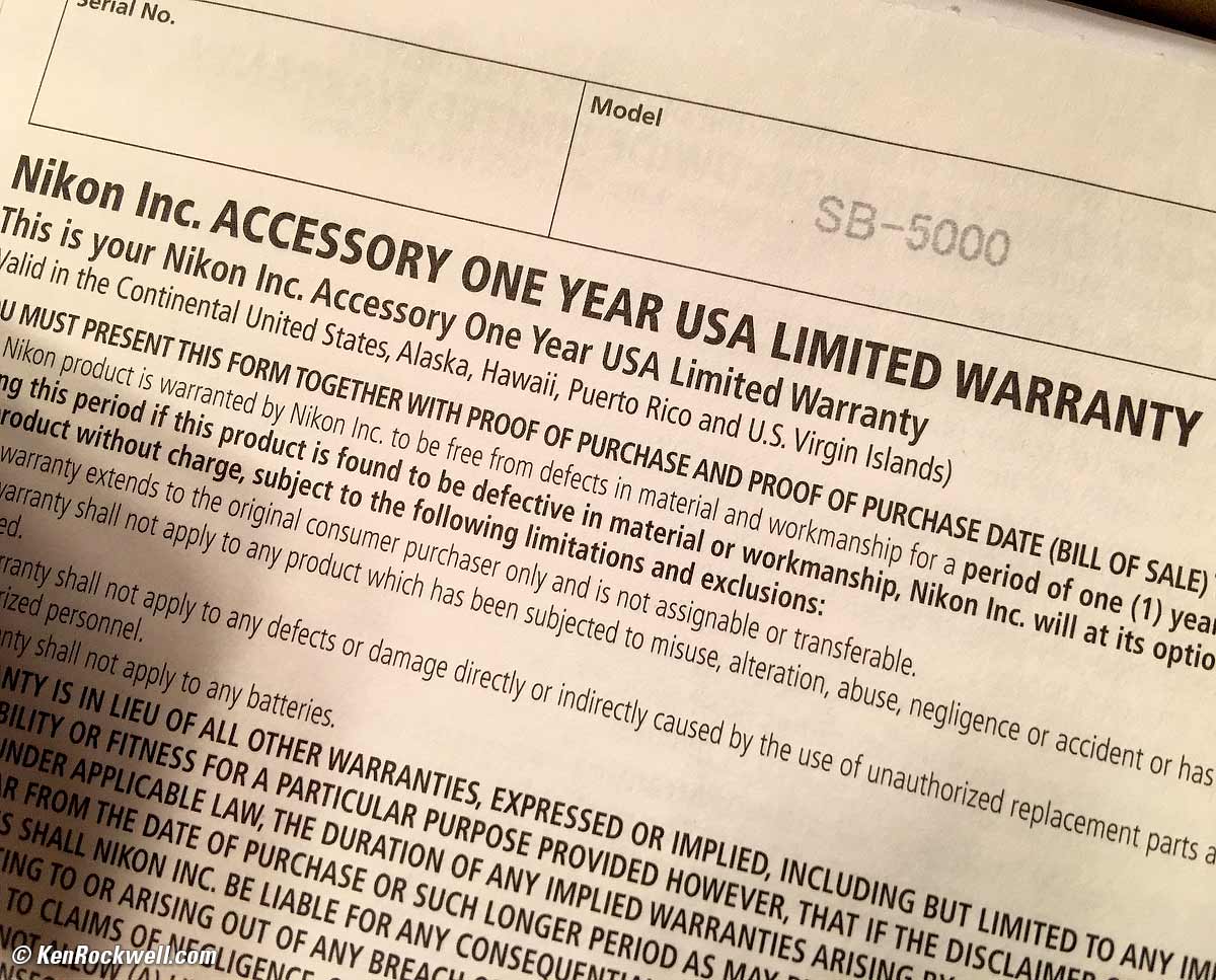 Where to Get YoursI got my SB-5000 at Adorama; I'd also get it at Amazon, at B&H or at Crutchfield, or get it used if you know How to Win at eBay. This all-content, junk-free website's biggest source of support is when you use those or any of these links to approved sources when you get anything, regardless of the country in which you live. Nikon does not seal its boxes in any way, so never buy at retail or any other source not on my personally approved list since you'll have no way of knowing if you're missing accessories, getting a defective, damaged, returned, store demo or used camera. I use the stores I do because they ship from secure remote warehouses where no one gets to touch your new camera before you do. Buy only from the approved sources I use myself for the best prices, service, return policies and selection. Thanks for helping me help you! Ken Rockwell.