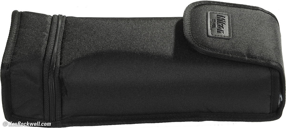 Specifications with commentary back to top Intro Specs Performance Recommendations Rated Guide Number (flash power): 131/40 in feet/meters at ISO 100, rated with zoom set to 35mm/FX in normal evenness mode. With all this hoopla, it's only one sixteenth of a stop brighter than the SB800, which has a GN of 125 in the same setting. Rated Recycle Time (full power): 4 seconds with alkalines, 2.3 seconds with NiMH. Rated Flashes at full power: 110 per set of alkalines, 190 per charge of 2,600 mAh NiMH. Swivel: 180º left or right, 90º up and 11º down. Useful Modes: TTL, Non-TTL auto, manual, wireless, FP sync. Games: Repeating flash (disco strobe mode), Auto Aperture, distance-priority manual. Power: 4 AA batteries. Size: 3.0 x 5.7 x 4.7" (78 x 146 x 118mm). (SB-800 is 2.8 x 5.0 x 3.6" (71 x 127 x 92mm).) Weight: 18.655 oz. (528.7g), measured with 4 Sanyo Eneloop AAs. Nikon specs 14.6 oz. (415g), empty. (SB-800 is 12.3 oz. (350g), empty.) Includes: AS-21 Speedlight Stand; SW-13H Diffusion Dome; SJ-900 Color Filter Set; SZ-2 Color Filter Holder; SS-900 Soft Case. SS-900 Case. Dig the bottom pocket for Nikon's included Sto-Fen thing. enlarge. Optional: SD-9 external battery holder ($190).
