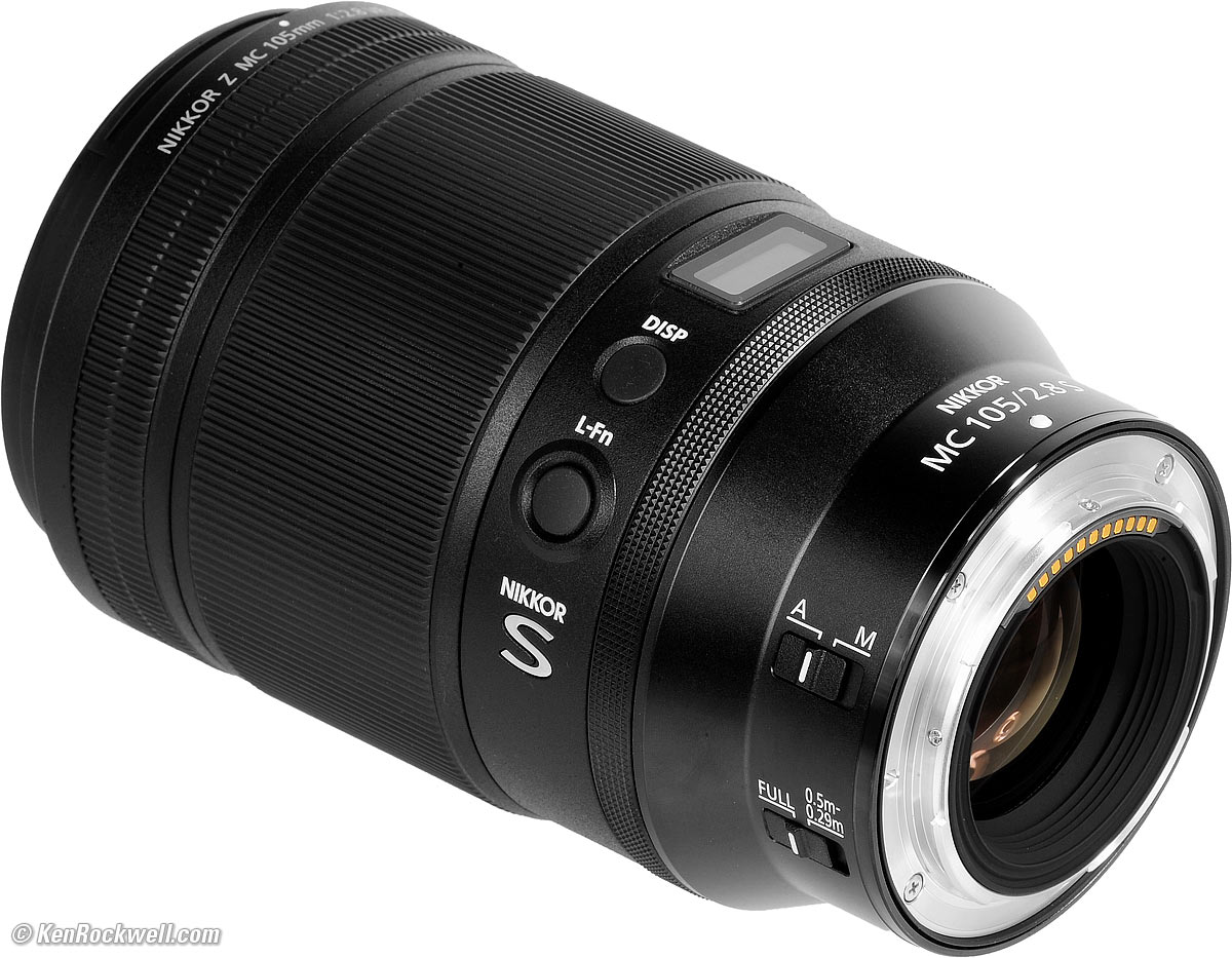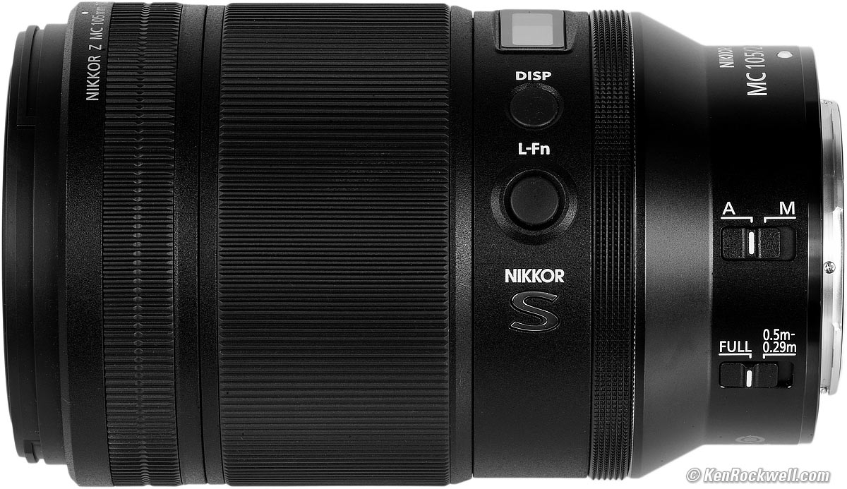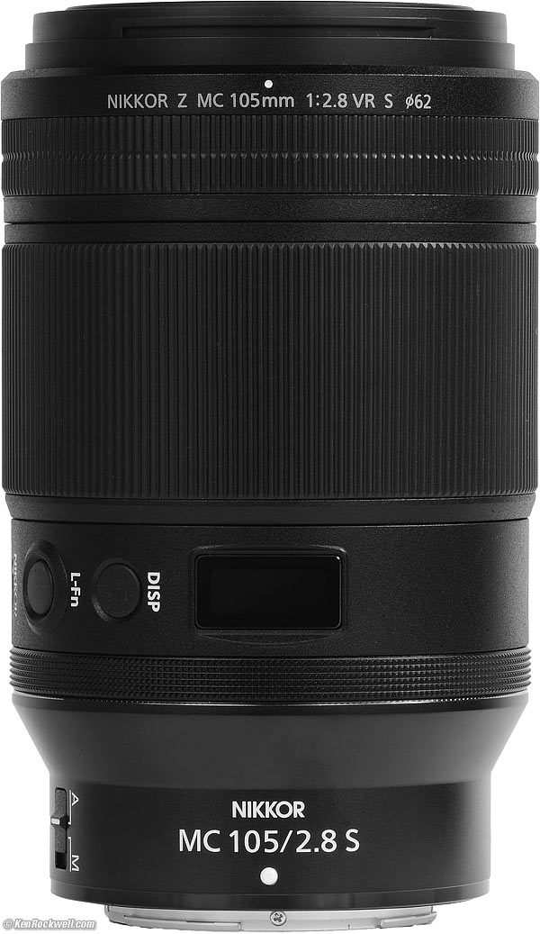 User's Guide topNew Good Bad Missing Format Compatibility Specifications USA Version Performance Comparisons User's Guide Recommendations I got my Z 105 Macro at B&H . I'd also get it at Adorama, at Amazon or at Crutchfield, or eventually used at eBay if you know How to Win at eBay. Nikon Z 105mm f/2.8 VR Macro. bigger. The slim rubber ring at the front is just for grip. It's handier than you'd expect; it's great for holding the lens steady while shooting, and also a Godsend to grab for mounting and unmounting the lens. The OLED display is just a gimmick. It turns off after a few seconds so you have to keep hitting the button. It does show distance and depth-of-field, reproduction ratio or aperture; just tap the button until you see what you want, and hold the button to set things like brightness or feet versus meters.