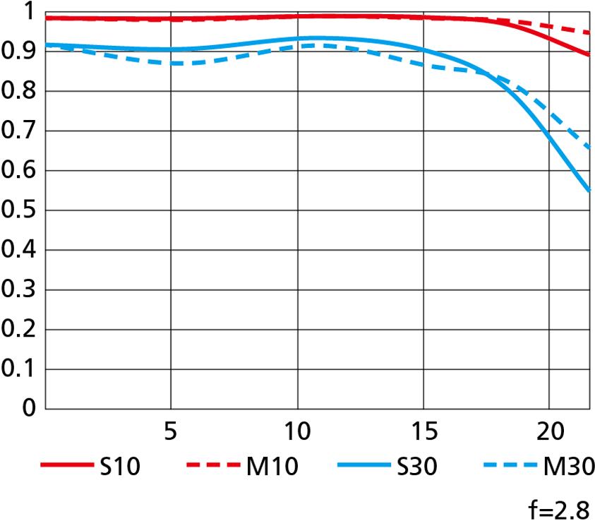 Sharpness performance topLens sharpness has nothing to do with picture sharpness; every lens made in the past 100 years is more than sharp enough to make super-sharp pictures if you know what you're doing. The only limitation to picture sharpness is your skill as a photographer. It's the least talented who spend the most time worrying about lens sharpness and blame crummy pictures on their equipment rather than themselves. Skilled photographers make great images with whatever camera is in their hands; I've made some of my best images of all time with an irreparably broken camera! Most pixels are thrown away before you see them, but camera makers don't want you to know that. If you're not getting ultra-sharp pictures with this, be sure not to shoot at f/11 or smaller where all lenses are softer due to diffraction, always shoot at ISO 100 or below because cameras become softer at ISO 200 and above, avoid shooting across long distances over land which can lead to atmospheric heat shimmer, be sure everything is in perfect focus, set your camera's sharpening as you want it (I set mine to the maximum) and be sure nothing is moving, either camera or subject. If you want to ensure a soft image with any lens, shoot at f/16 or smaller at ISO 1,600 or above at default sharpening in daylight of subjects at differing distances in the same image. People worry waaaaay too much about lens sharpness. It's not 1968 anymore when lenses often weren't that sharp and there could be significant differences among them; today they are all pretty much equally fantastic. This lens is ultra-sharp in the lab from corner to corner at every aperture except for diffraction which plagues all lenses at the smallest apertures. As this is a macro lens, be forewarned that nothing is ever in focus at macro distances other than a vapor thin imaginary plane that probably never intersects with your subject. The biggest problem in pro macro shooting is trying to get your subject to lay flat enough to stay in a very thin plane of focus, even at f/32. Nikon's MTF chart at 10 cyc/mm and 30 cyc/mm. The solid lines are the sagittal (radial) and the dotted lines are the meridional (tangential) measurements.