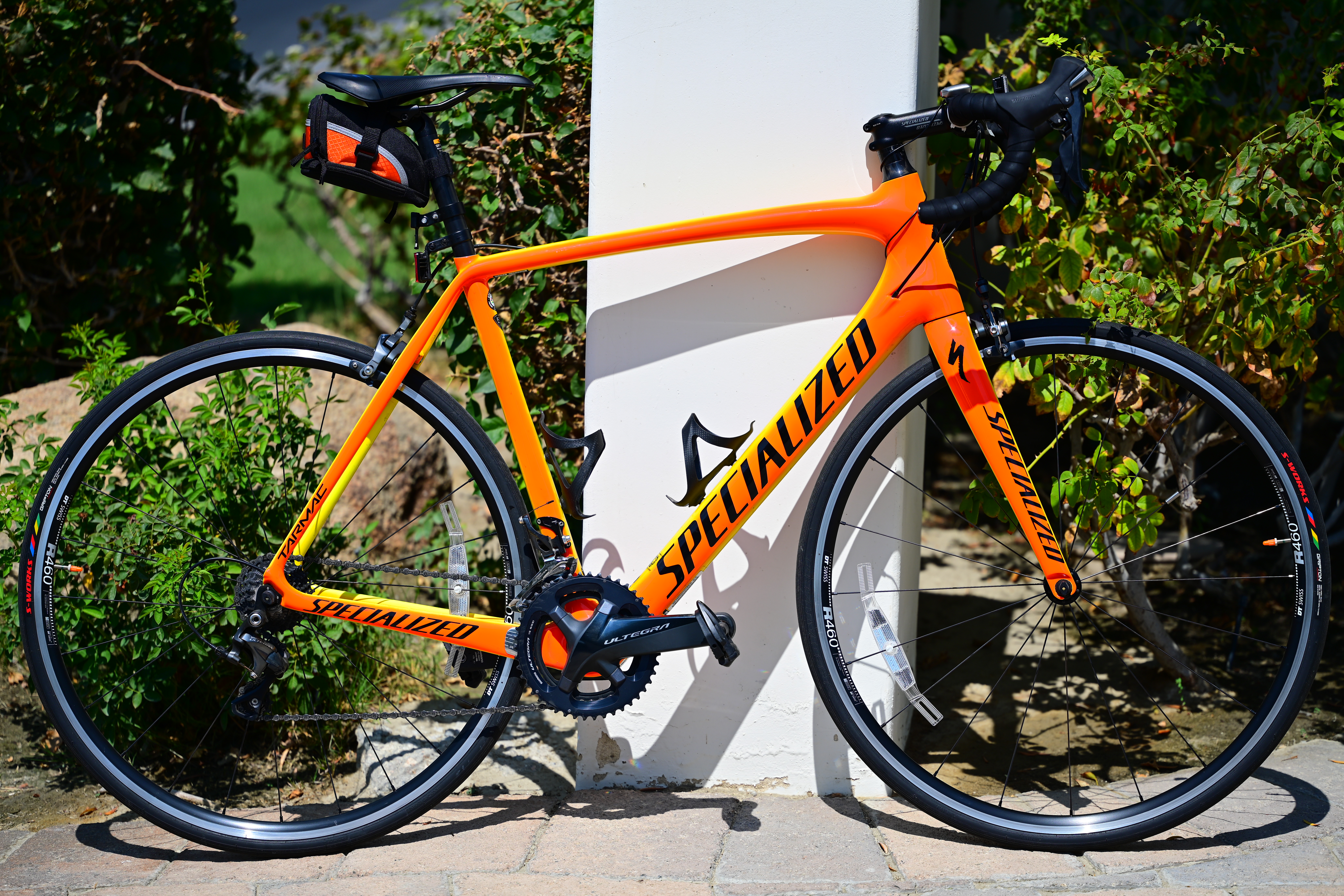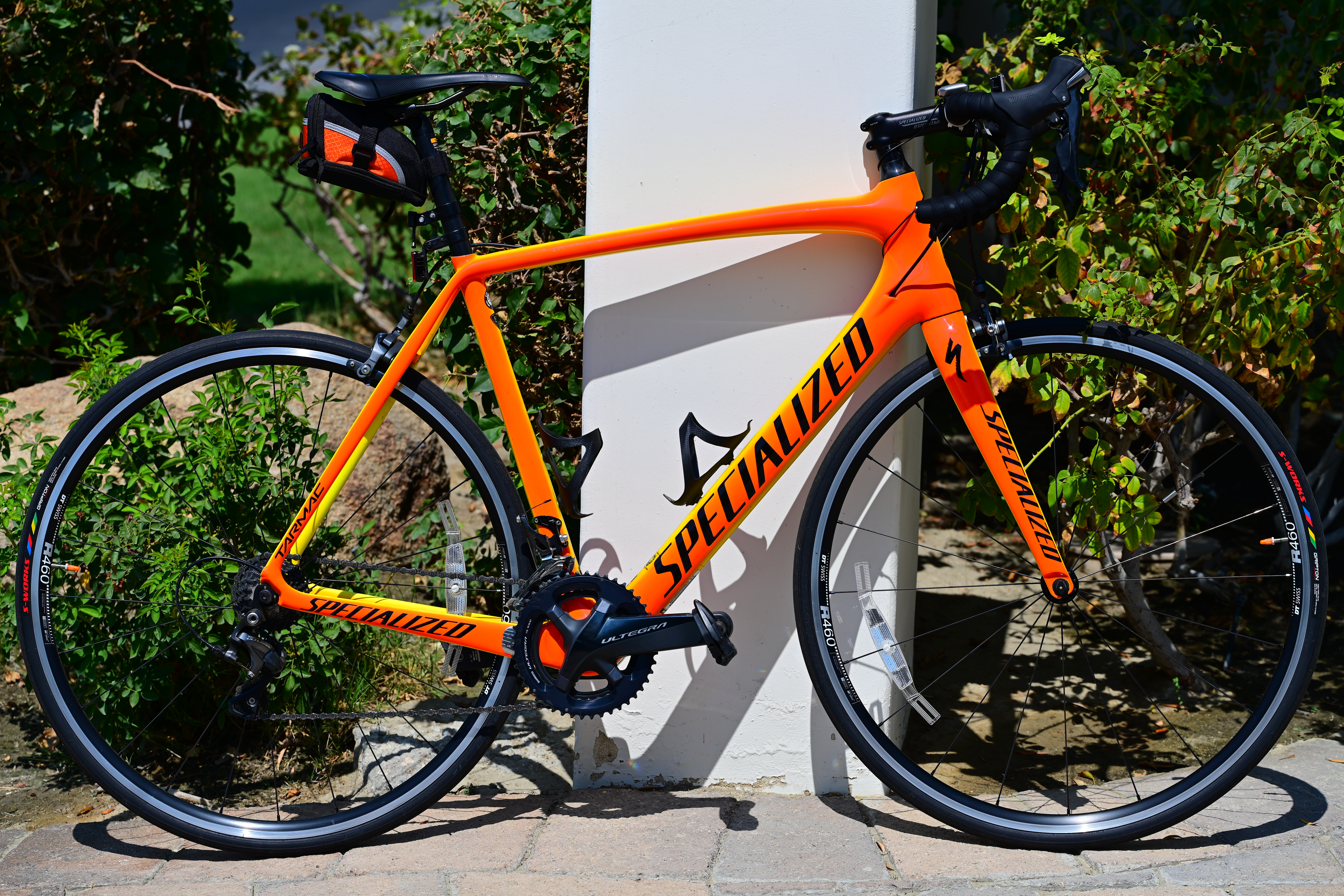 Wide-Open at f/2.82017 Specialized Tarmac Comp 58cm, Torch Edition with orange Presta valve caps, Shimano Dura-Ace CS-R9100 12-25T cassette, Shimano Integra FC-R8000 175mm 46-36T crankset, Shimano Dura-Ace PD-R9100 pedals and awesomely inexpensive ($14), light (24g) and strong carbon-fibre bottle cages, 10:56 AM, 17 July 2021. Nikon Z7 II, wide-open at f/2.8 at 1/1,600 at Auto ISO 64 (LV 14¼), exactly as shot. bigger or camera-original © JPG file. As expected for a macro lens, it's ultrasharp even in the corners at f/2.8. In this case, I can read the microscopic lettering on my tire on the far left edge of the image: 1,200 × 900 pixel (6.8× magnification) crop from above. bigger or camera-original © JPG file.