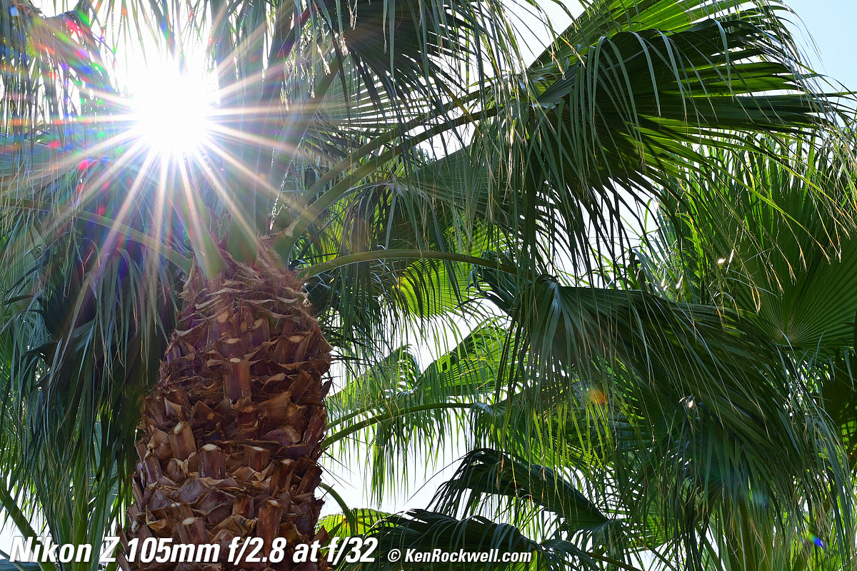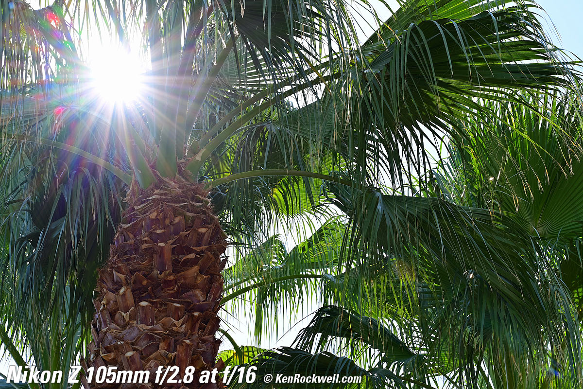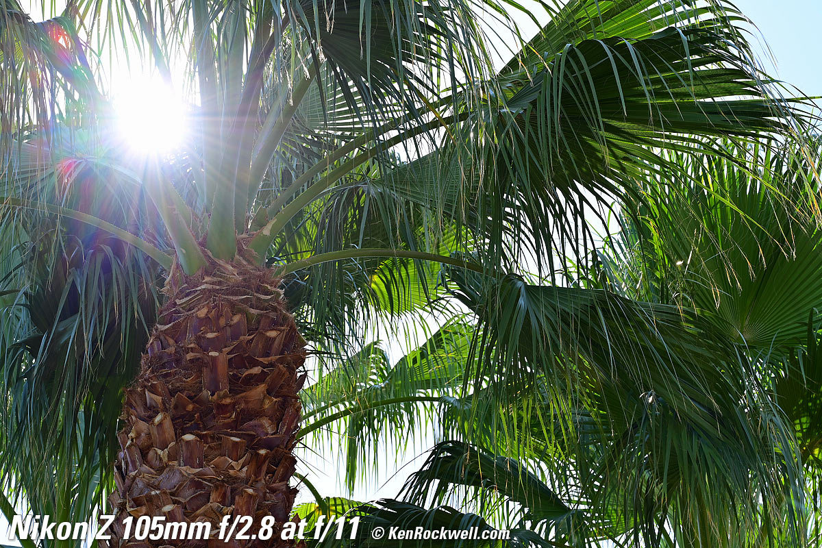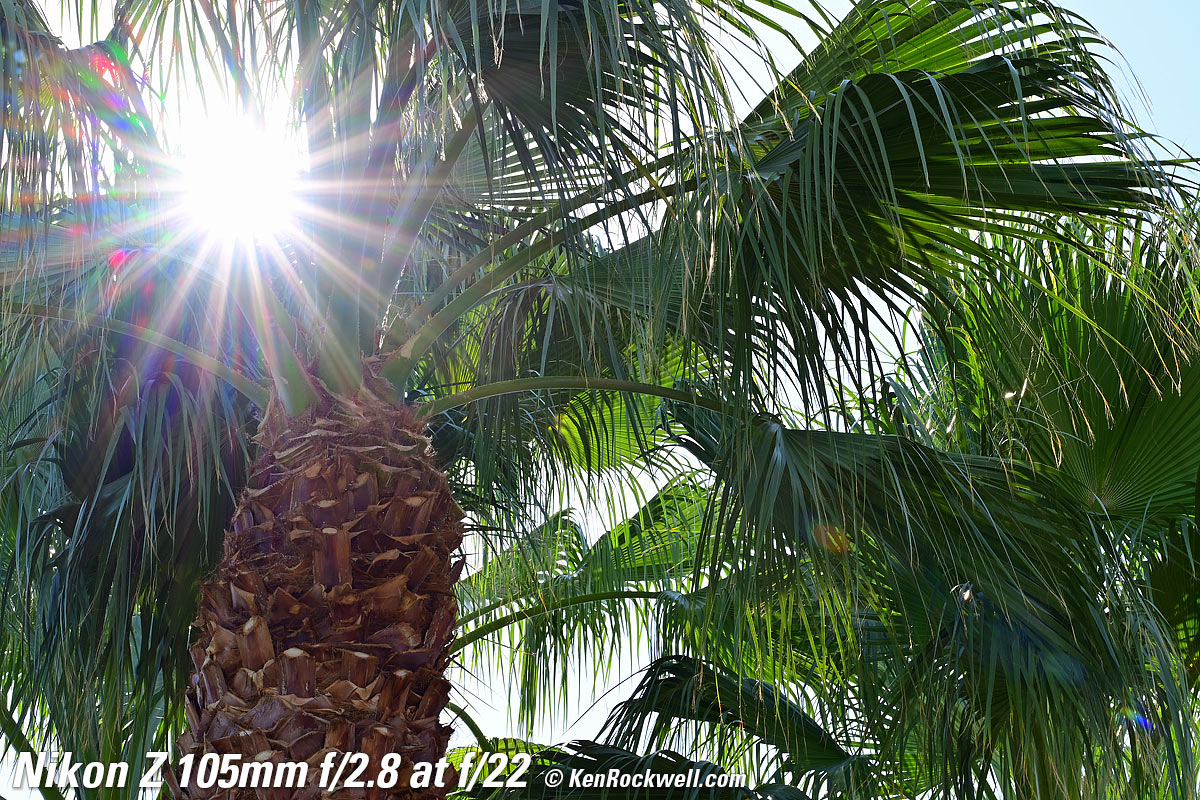 Sunstars performance topWith a 9-bladed rounded diaphragm, I get 18-pointed sunstars on brilliant points of light only at the smallest apertures. Ignore the vertical smear at large apertures, this is is a sensor artifact called interline transfer smear and not a lens defect. Likewise ignore the crazy red, green and blue dots at small apertures; these are sensor artifacts caused by taking a picture directly of the sun and exposing for the dark underside of a huge palm tree, and using that same palm tree to hide the sky to accentuate the stars. Click any to enlarge: Click any to enlarge.