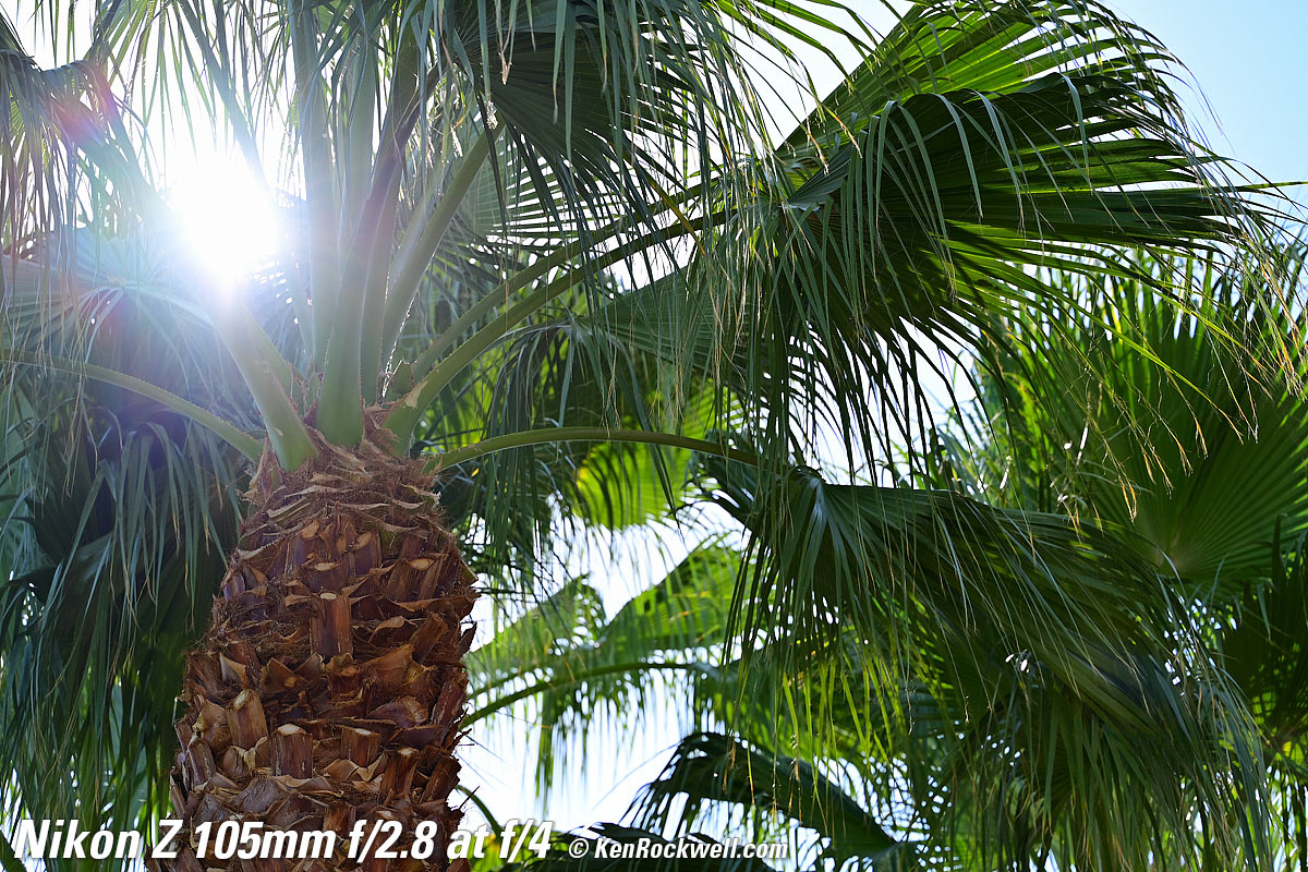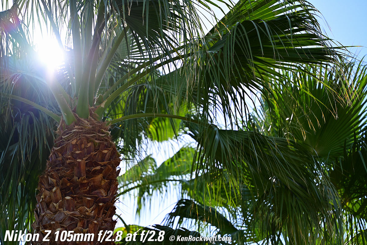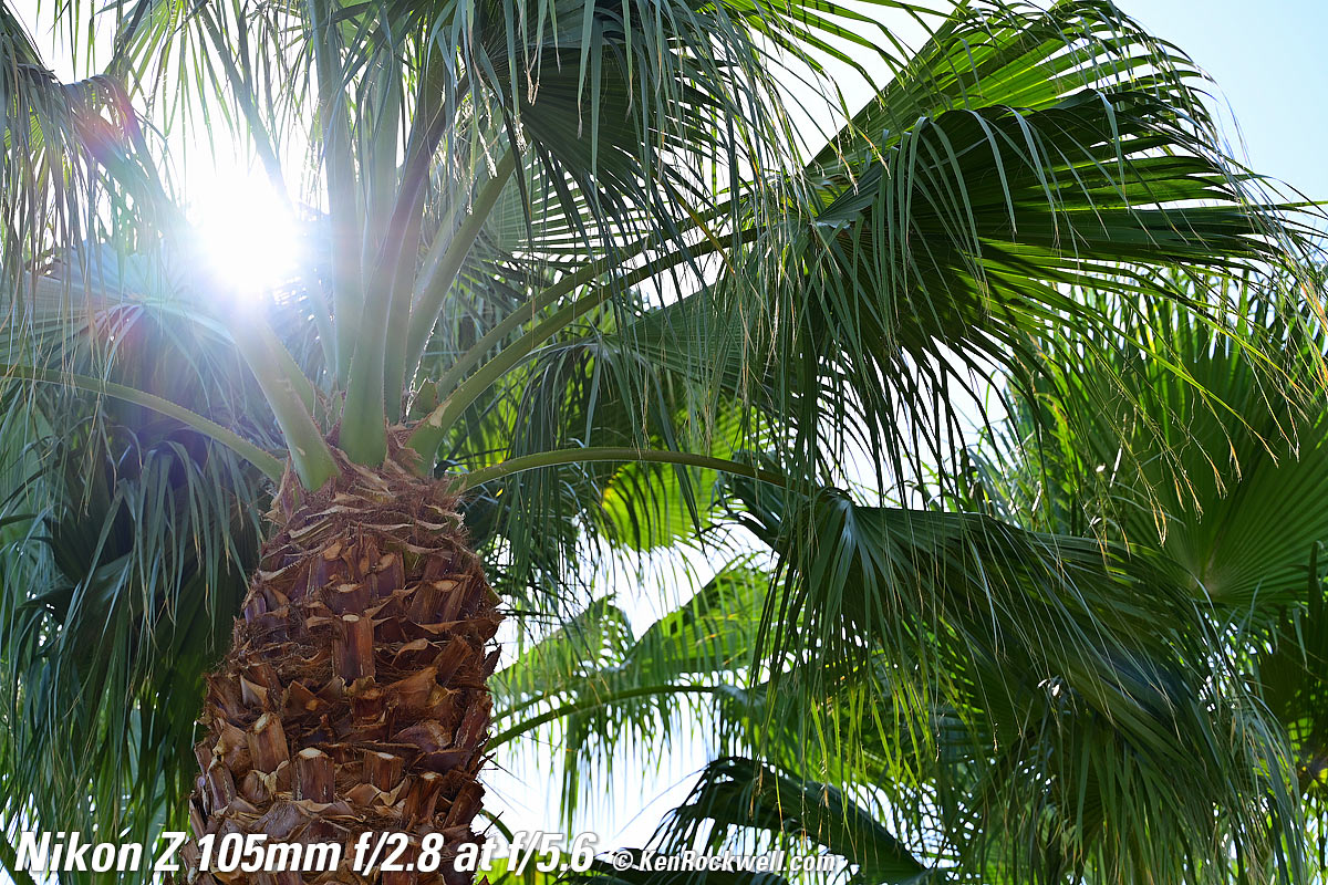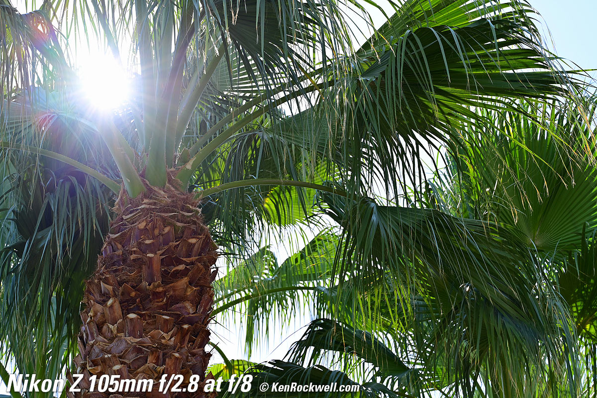 Sunstars performance topWith a 9-bladed rounded diaphragm, I get 18-pointed sunstars on brilliant points of light only at the smallest apertures. Ignore the vertical smear at large apertures, this is is a sensor artifact called interline transfer smear and not a lens defect. Likewise ignore the crazy red, green and blue dots at small apertures; these are sensor artifacts caused by taking a picture directly of the sun and exposing for the dark underside of a huge palm tree, and using that same palm tree to hide the sky to accentuate the stars. Click any to enlarge: Click any to enlarge.