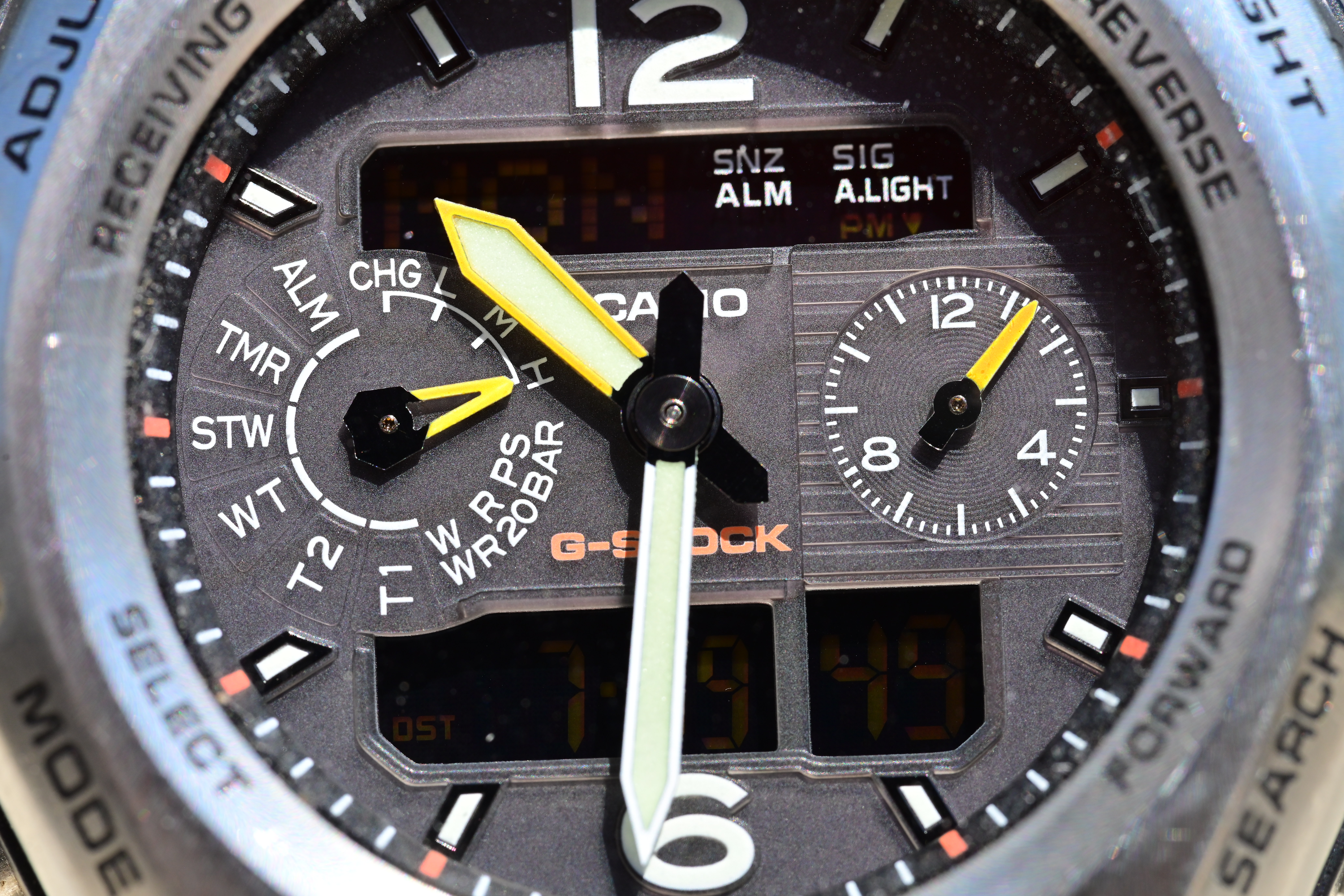 At f/16It's super sharp at f/16 because much more is in focus — but still not that much. This is how macro works at these distances; there is always very little in focus and that's the biggest block to getting sharp pictures; not your lens. As expected if you look closely, while more is in focus at f/16, the peak sharpness is less due to diffraction. The depth-of-field for all macro lenses is still approximately zero at f/16 at these close distances wide-open. Very little is in focus and this is as straight as I could align the watch, so only some sections of the face are in focus. The rest is out of focus and not supposed to be sharp. Casio G-Shock Solar Atomic Watch at 1:1 close-focus distance, 19 July 2021. Nikon Z7 II, f/16 at 1/125 at ISO 360 (LV 13.1). bigger or camera-original © file.
