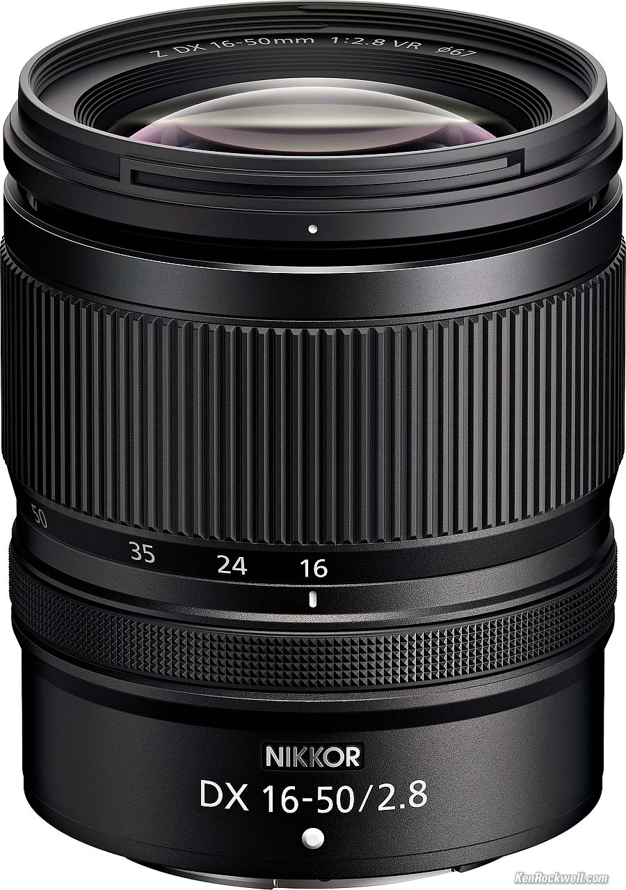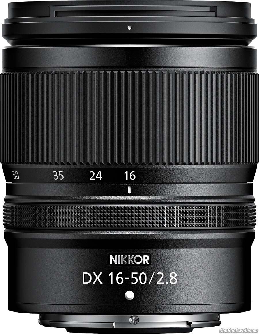 Nikon Z 16-50mm f/2.8 DX VR24~75mm equivalent (2025 ~ today)Introduction New Good Bad Missing Specifications Performance Recommendations Z9 Z8 Z7II Z6III Z6II Zƒ Z7 Z6 Z5II Z5 ZR Zƒc Z50II Z50 Z30 Z System Z Lenses All Nikon Lenses Flash Nikon Z 16-50mm f/2.8 VR DX (67mm filters, 11.6 oz. (330g), 0.5~0.8' (0.15~0.25m) close focus, 0.24× macro ratio, $897). bigger. I ordered mine at B&H. I'd also get it at Adorama, or get it used if you know How to Win at eBay, or get it used at KEH. This 100% all-content, junk-free website's biggest source of support is when you use those or any of these links to my personally approved sources I've used myself for way over 100 combined years when you get anything, regardless of the country in which you live — but I receive nothing for my efforts if you take the chance of getting it elsewhere. Nikon does not seal its boxes in any way, so never buy at retail or any other source not on my personally approved list since you'll have no way of knowing if you're missing accessories, getting a defective, damaged, returned, dropped, incomplete, gray-market, store demo or used lens — and my personally approved sources allow for 100% cash-back returns for at least 30 days if you don't love your new lens. I've used many of these sources since the 1970s because I can try it in my own hands and return it if I don't love it, and because they ship from secure remote warehouses where no one gets to touch your new lens before you do. Buy only from the approved sources I've used myself for decades for the best prices, service, return policies and selection.