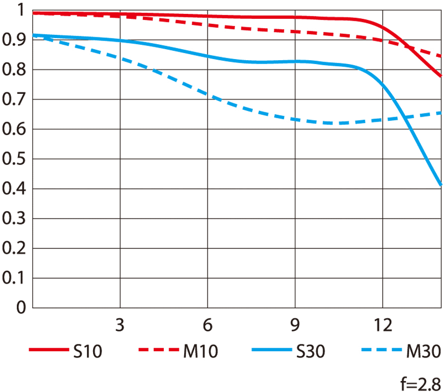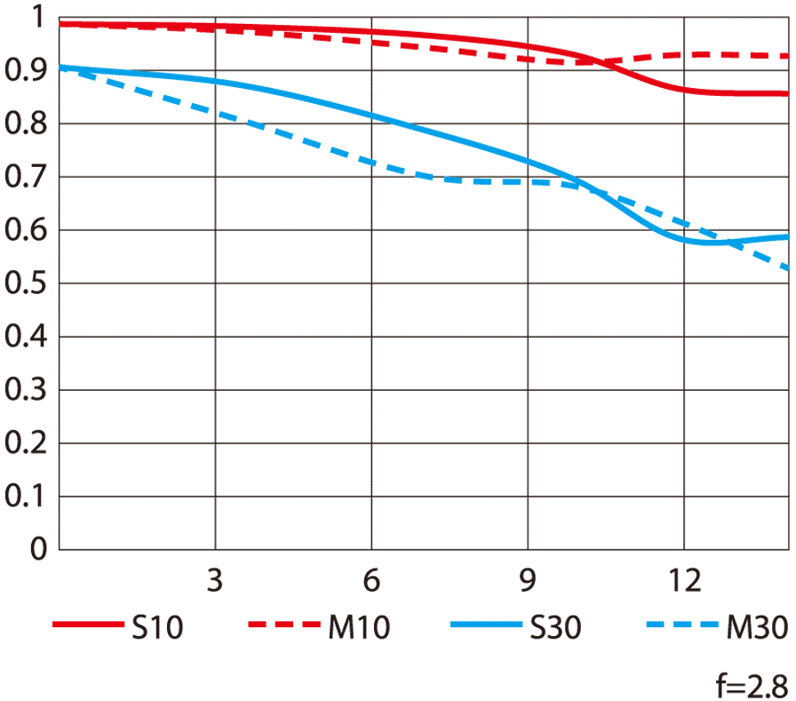 Sharpness performance topNikon's MTF at 10 cyc/mm and 30 cyc/mm. Sagittal (radial) shown as solid lines. Meridional (tangential) shown as dashed lines. While it's usually valid to compare rated MTFs between different lenses of similar vintage from the same maker, every maker measures or simply calculates MTF very differently, and therefore one cannot compare these curves between brands. For instance, Sony seems to ignore diffraction and simply calculate overly optimistic MTFs that hug 100%, which no real lens can do at f/8, while other brands are more realistic and include diffraction. Only Canon offers any insight on how they arrive at their curves. See also my article on MTF and Canon's article on MTFs.