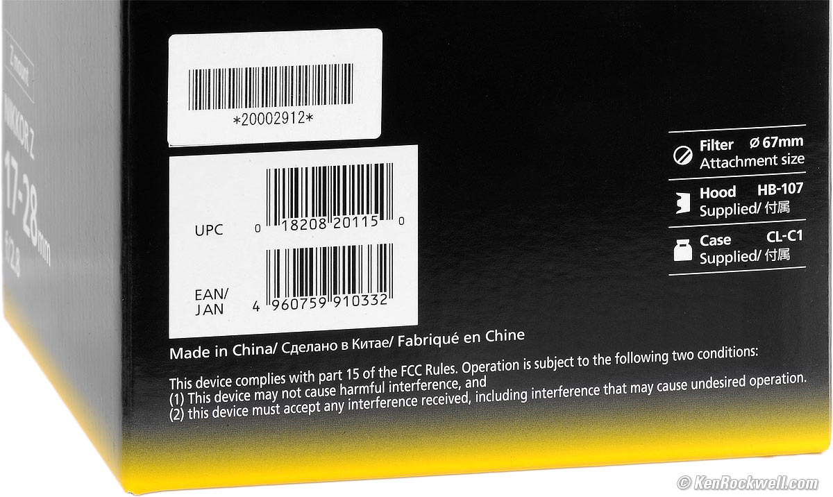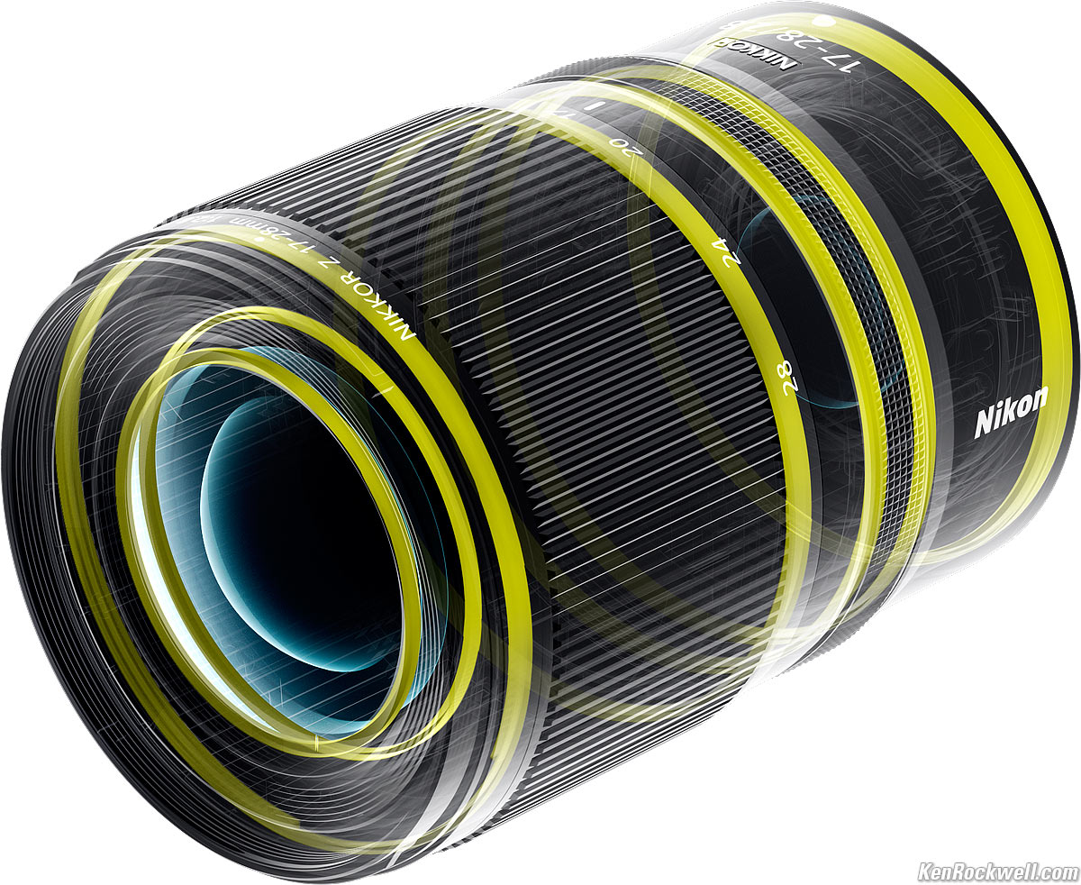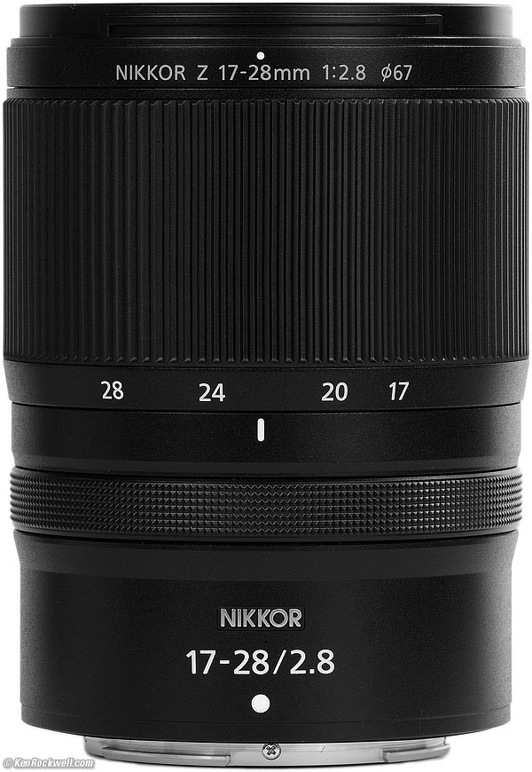Recommendations topSample Images Intro New Good Bad Missing Compatibility Specifications Performance I got my 17-28mm f/2.8 at B&H. I'd also get it at Adorama, at Amazon or at Crutchfield, or used at eBay if you know How to Win at eBay. What's not to to like? The only downside is that the 17-28mm zoom range is very limited. It almost doesn't feel as if it's zooming at all; even a 20-35mm lens has a larger zoom ratio. You may also want to consider the fixed Z 20mm f/1.8, which costs even less and is even faster, but with even less zoom range. Honestly when you shoot with the 17-28mm versus the fixed 20mm, the 17-28 doesn't zoom that far away from 20mm. If you need speed, go for the Z 20mm f/1.8, and if you want speed in a lightweight zoom, God bless Nikon for giving us this choice as well. Bravo! The real question is do you need f/2.8? I don't, so I prefer the Z 14-30mm f/4 which has a much wider zoom range for about the same price. I rarely use f/2.8, but I do use the 14-17mm range absent on this 17-28mm, but that's just me. It's great that Nikon has so many options to make us all happy. I use a clear (UV) protective filter instead of a cap so I'm always ready to shoot instantly. I only use a cap when I throw this in a bag with other gear without padding — which is never. The UV filter never gets in the way, and never gets lost, either. The very best protective filter is the nearly indestructible Hoya multicoated HD3 67mm UV which uses hardened glass and repels dirt and fingerprints. For less money, the B+W 67mm XS-PRO MRC-nano 010M, Nikon 67mm NC (No Color/Neutral Clear), Hoya 67mm NXT Plus UV and Hoya 67mm UV MC are all excellent filters, but the Hoya HD3 is the toughest and the best. If I was working in nasty, dirty areas, I'd use an uncoated 67mm Tiffen UV filter instead. Uncoated filters are much easier to clean, but more prone to ghosting. All these filters are just as sharp and take the same pictures, the difference is how much abuse they'll take and stay clean and stay in one piece. Since filters last a lifetime or more, there's no reason not to buy the best as it will last you for the next 50 years. Filters aren't throwaways like digital cameras which we replace every few years, like it or not. I'm still using filters I bought back in the 1970s! The Hoya HD3 stays cleaner than the others since it repels oil and dirt, and you'll be using it long after you've thrown this lens away in 50 years. I got my 17-28mm f/2.8 at B&H. I'd also get it at Adorama, at Amazon or at Crutchfield, or used at eBay if you know How to Win at eBay. This 100% all-content, junk-free website's biggest source of support is when you use those or any of these links to my personally approved sources I've used myself for way over 100 combined years when you get anything, regardless of the country in which you live — but I receive nothing for my efforts if you get it elsewhere. Nikon does not seal its boxes in any way, so never buy at retail or any other source not on my personally approved list since you'll have no way of knowing if you're missing accessories, getting a defective, damaged, returned, dropped, incomplete, gray-market, store demo or used lens — and all of my personally approved sources allow for 100% cash-back returns for at least 30 days if you don't love your new lens. I've used many of these sources since the 1970s because I can try it in my own hands and return it if I don't love it, and because they ship from secure remote warehouses where no one gets to touch your new lens before you do. Buy only from the approved sources I've used myself for decades for the best prices, service, return policies and selection. Thanks for helping me help you! Ken.