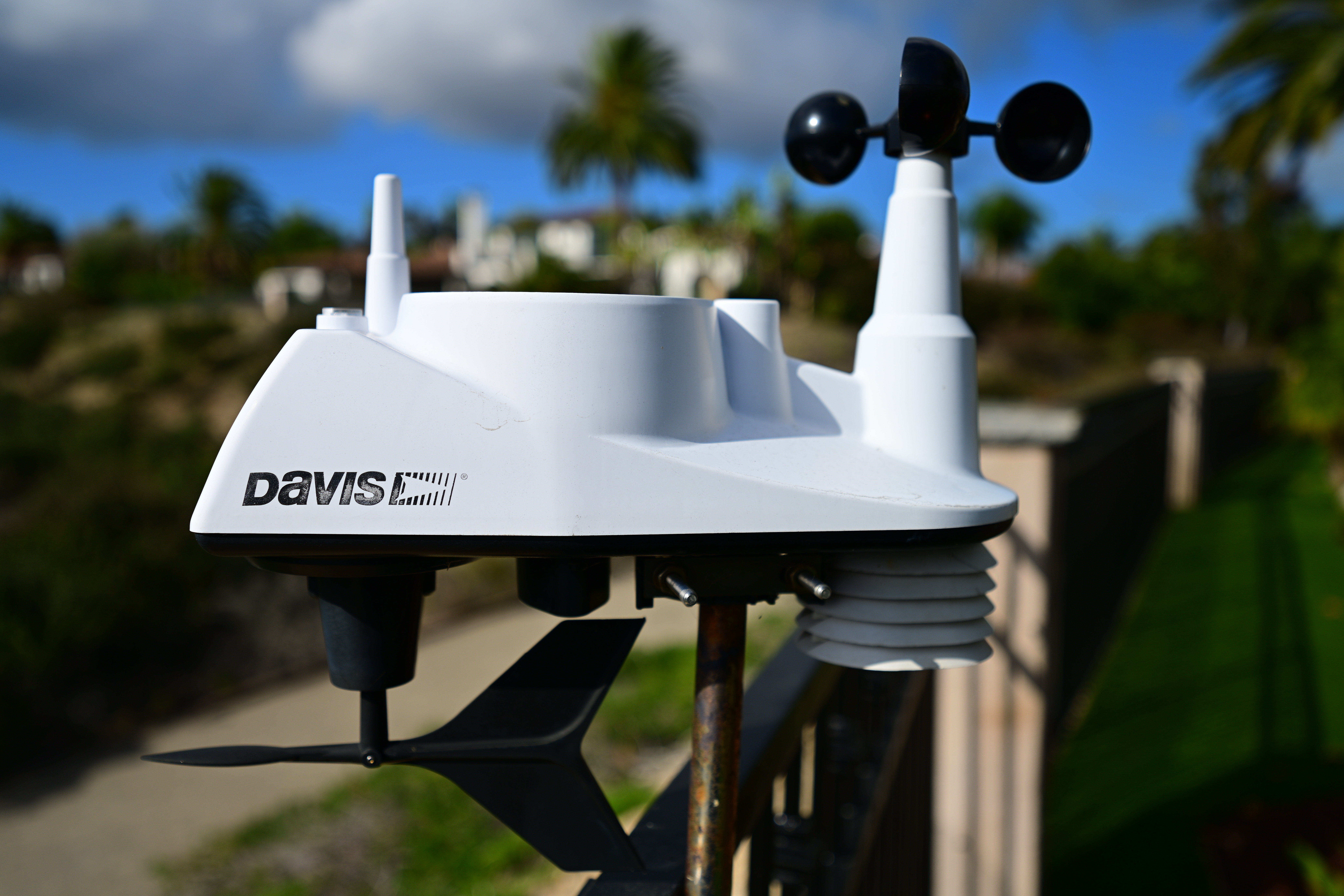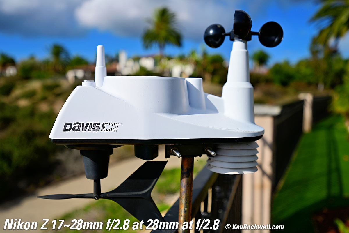 Bokeh performance topBokeh, the feel, character or quality of out-of-focus areas as opposed to how far out of focus they are, is reasonably good. Backgrounds don't usually distract, but with a lens this wide they rarely get that far out of focus either. Here are photos from headshot distance wide-open. I'm focused on the DAVIS logo. Click either for the © camera-original file: Made-in-U. S. A. Davis 6250 weather station, 11:20 AM, Tuesday, 29 November 2022. Nikon Z7 II, Nikon Z 17-28mm f/2.8 at 1/2,500 and 1/3,200at Auto ISO 64 (LV 14.9 and 15.3), Radiant Imaging Software. Click either for the 45 MP camera-original © JPG file (about 4 MB each).