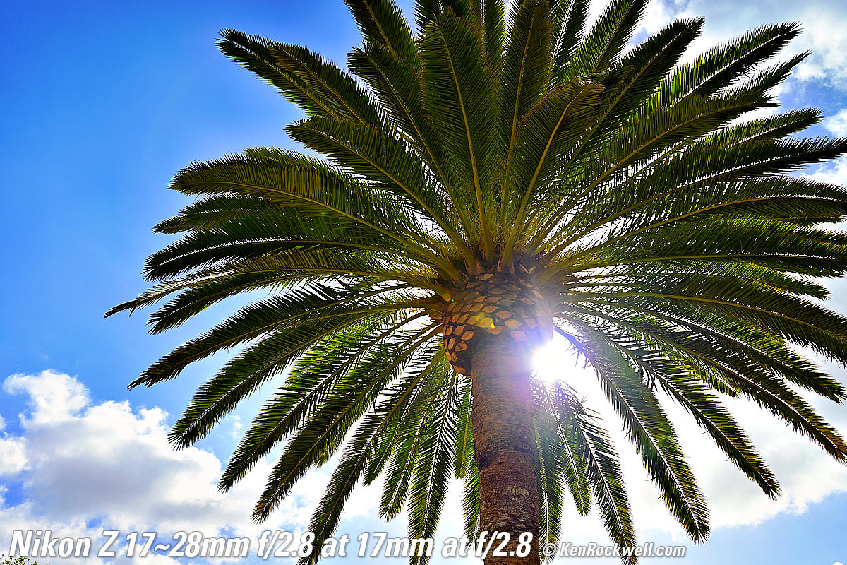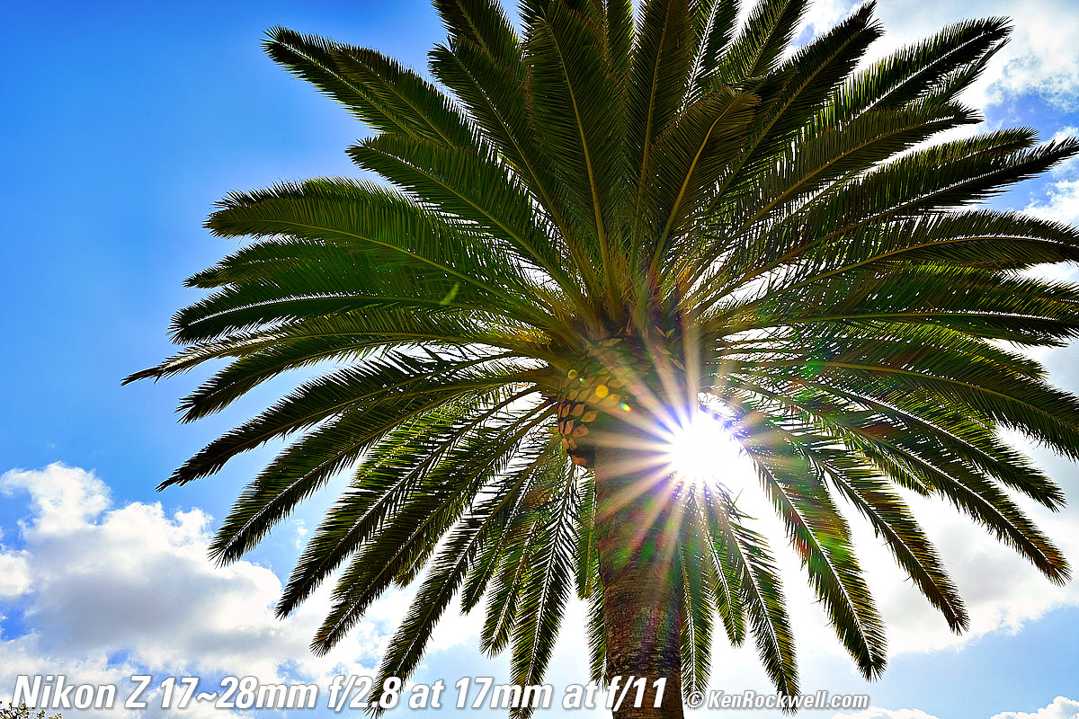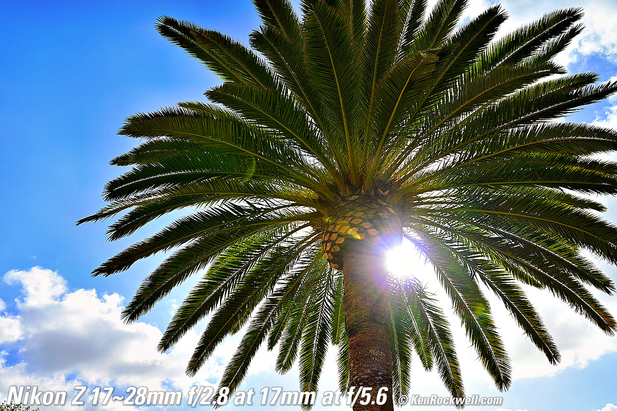 Sample Images topSample Images Intro New Good Bad Missing Compatibility Specifications Performance More samples throughout this review at Bokeh, Falloff, Macro, Spherochromatism and Sunstars. These are just snapshots; my real work is in my Gallery. These are all shot hand-held as BASIC ★ JPGs; no tripods, NORMAL or FINE JPGs or RAW files were used or needed. Canary Palm, 11:21 AM, Thursday, 29 November 2022. Z7 II, Z 17-28mm f/2.8 at 24mm wide-open at f/2.8 at 1/640 at Auto 64 (LV 12.9), Radiant Photo software. bigger or camera-original © JPG file. This is shot at f/2.8, where lenses are their softest, and this lens is already ultra sharp corner-to-corner. Of course at f/2.8 very little, like the bottom of the trunk and the more distant fronds, are in focus, but what is in focus is ultra sharp.