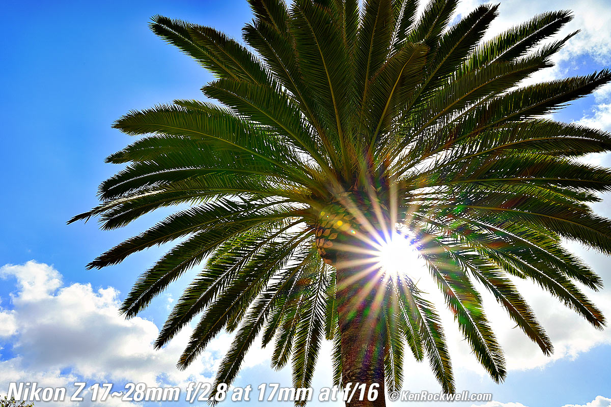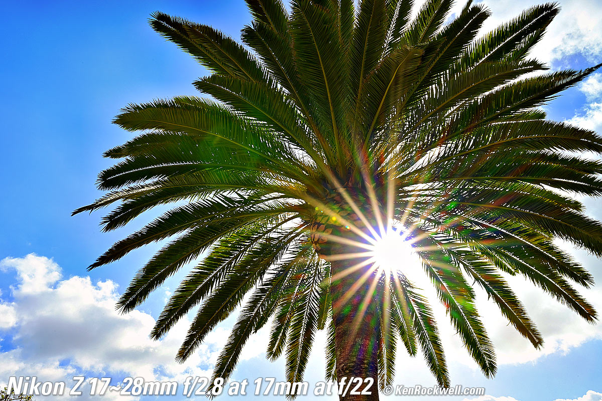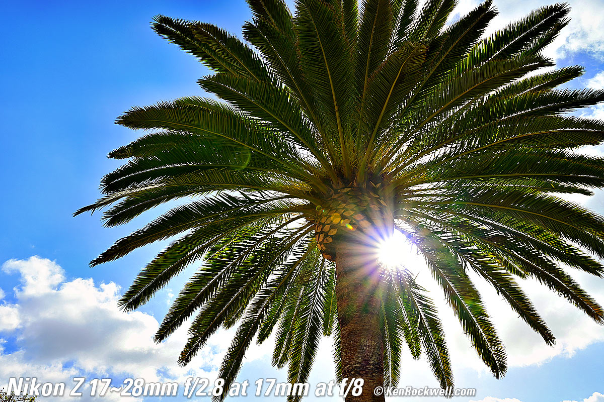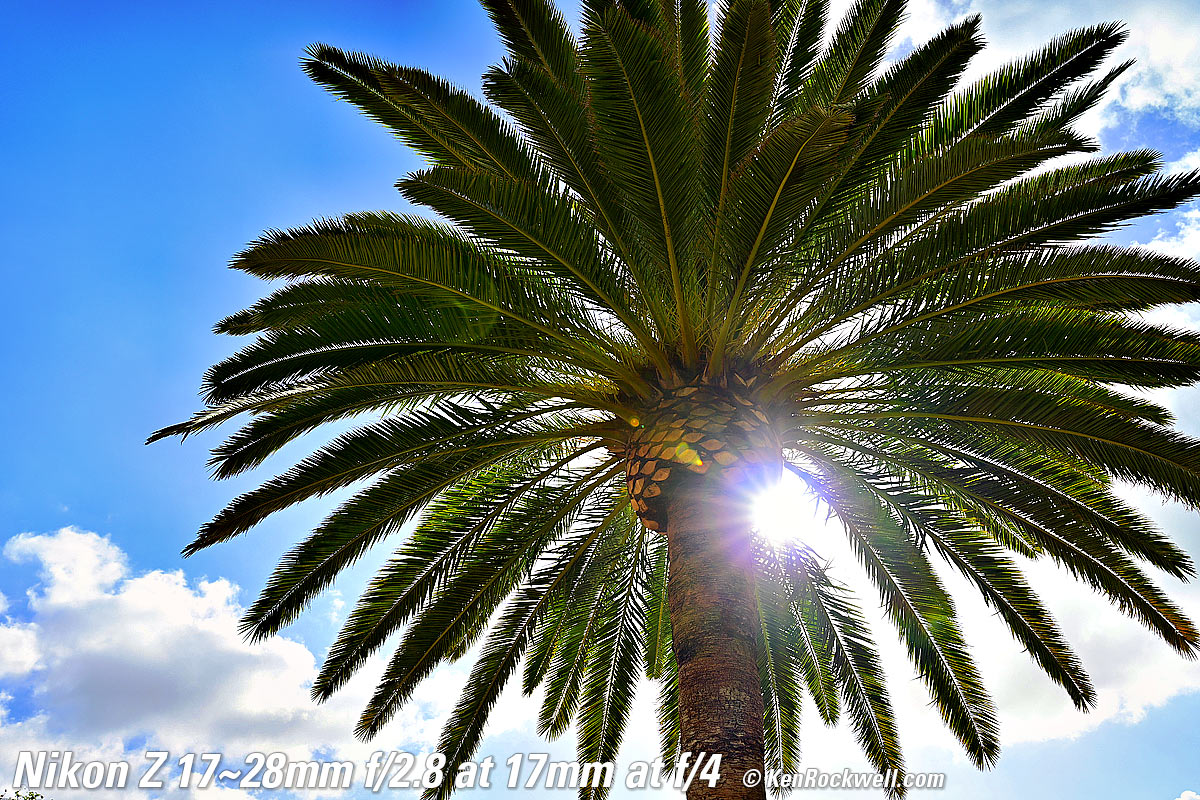 Sample Images topSample Images Intro New Good Bad Missing Compatibility Specifications Performance More samples throughout this review at Bokeh, Falloff, Macro, Spherochromatism and Sunstars. These are just snapshots; my real work is in my Gallery. These are all shot hand-held as BASIC ★ JPGs; no tripods, NORMAL or FINE JPGs or RAW files were used or needed. Canary Palm, 11:21 AM, Thursday, 29 November 2022. Z7 II, Z 17-28mm f/2.8 at 24mm wide-open at f/2.8 at 1/640 at Auto 64 (LV 12.9), Radiant Photo software. bigger or camera-original © JPG file. This is shot at f/2.8, where lenses are their softest, and this lens is already ultra sharp corner-to-corner. Of course at f/2.8 very little, like the bottom of the trunk and the more distant fronds, are in focus, but what is in focus is ultra sharp.